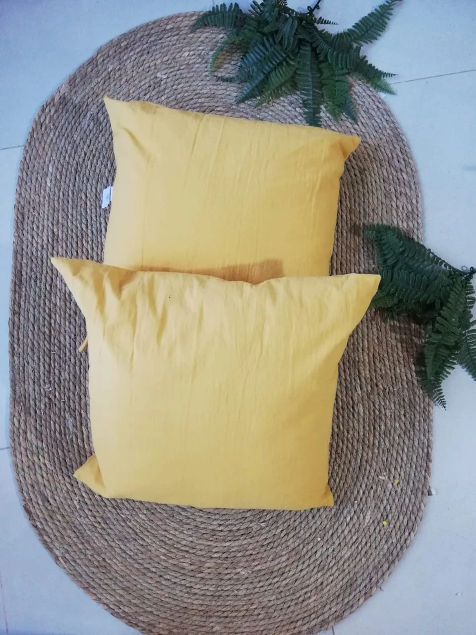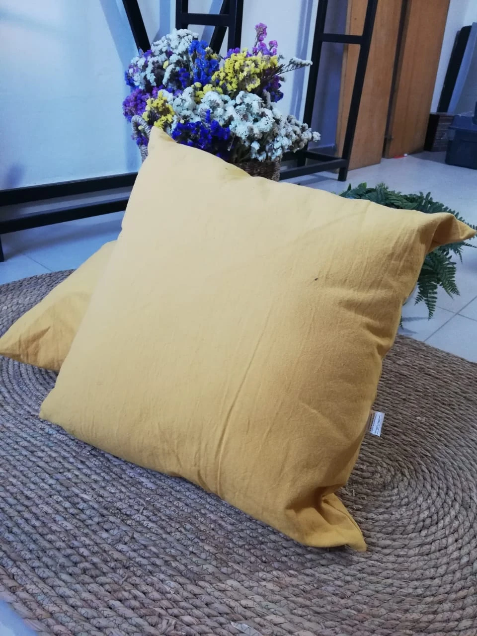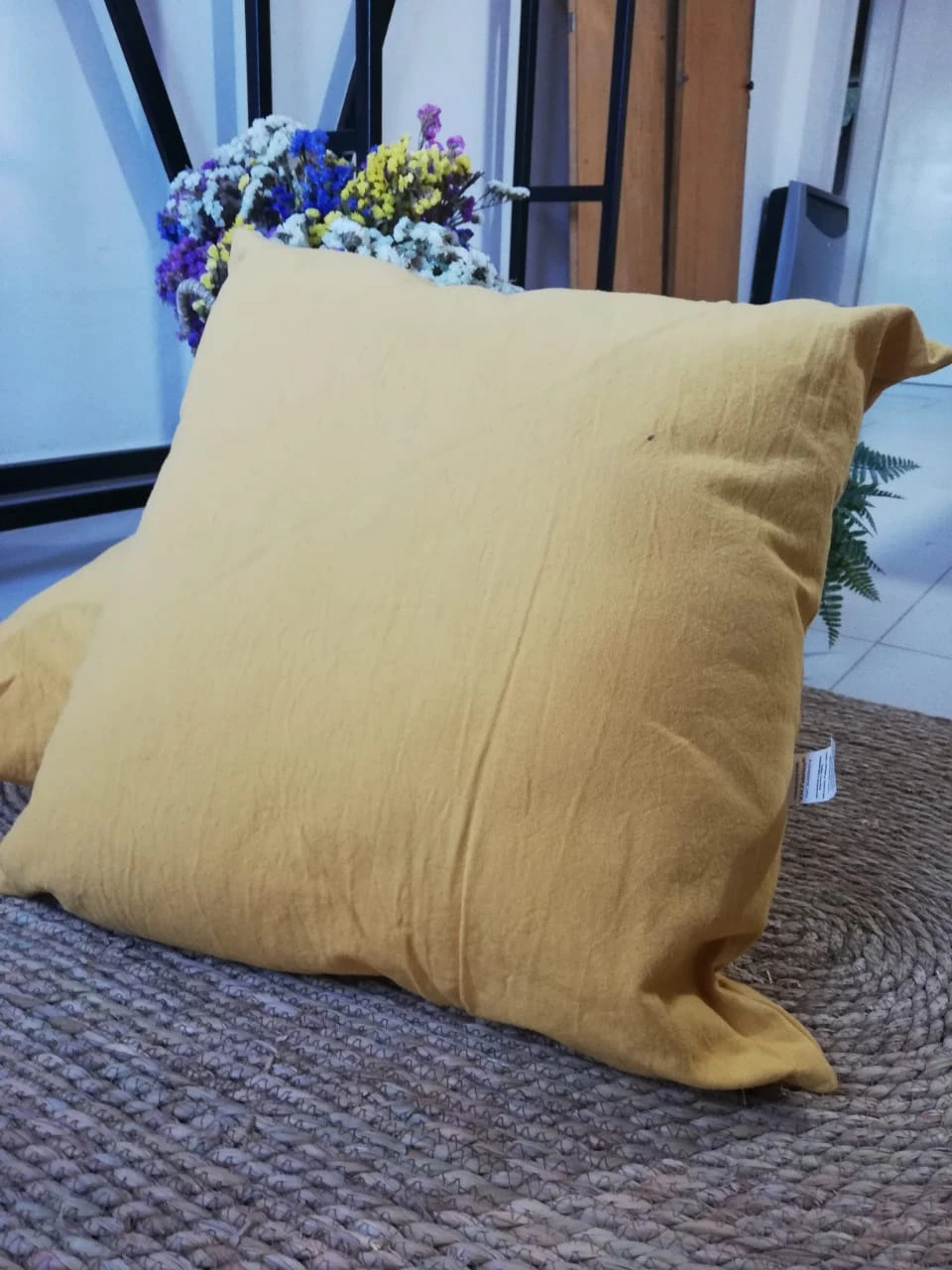 Almohadón confeccionado en tela de tusor en tono mostaza, de color y textura simple, sin detalles. Mide 50 x 50 cm. Con cierre para desmonte y lavado de funda.