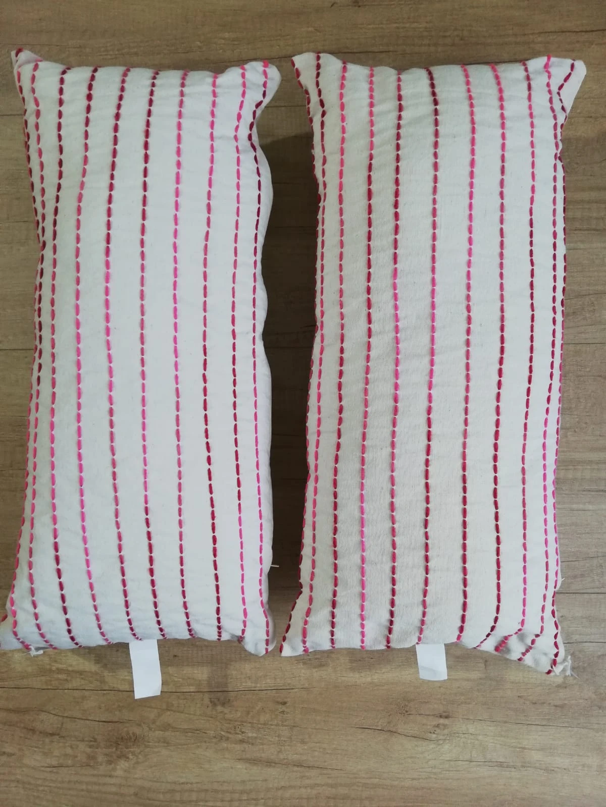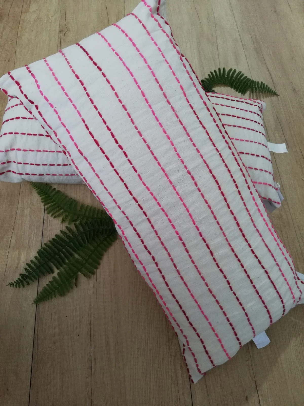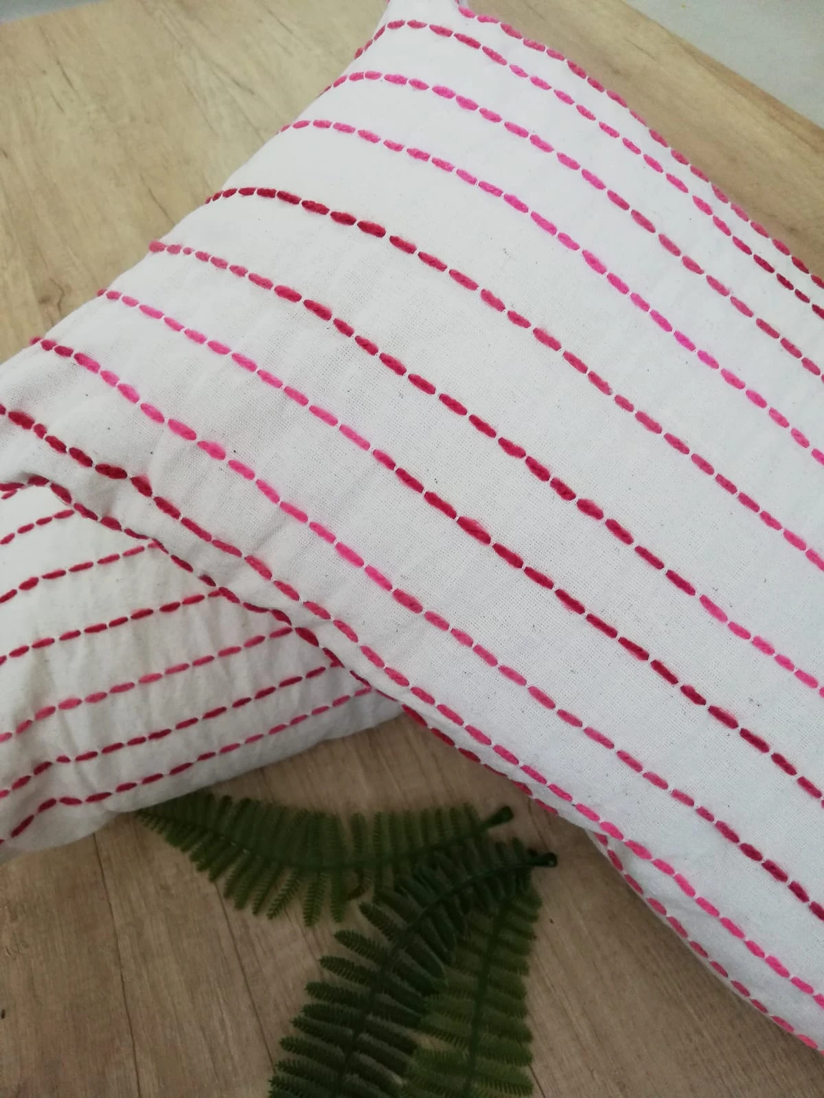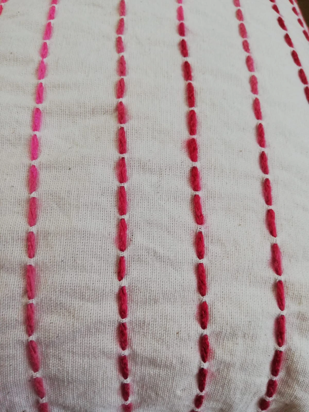 Almohadón confeccionado en tela de tusor beige, con detalles tejidos en hilos de lana color rosa en tonos degradé. Con cierre para desmonte y lavado de funda.