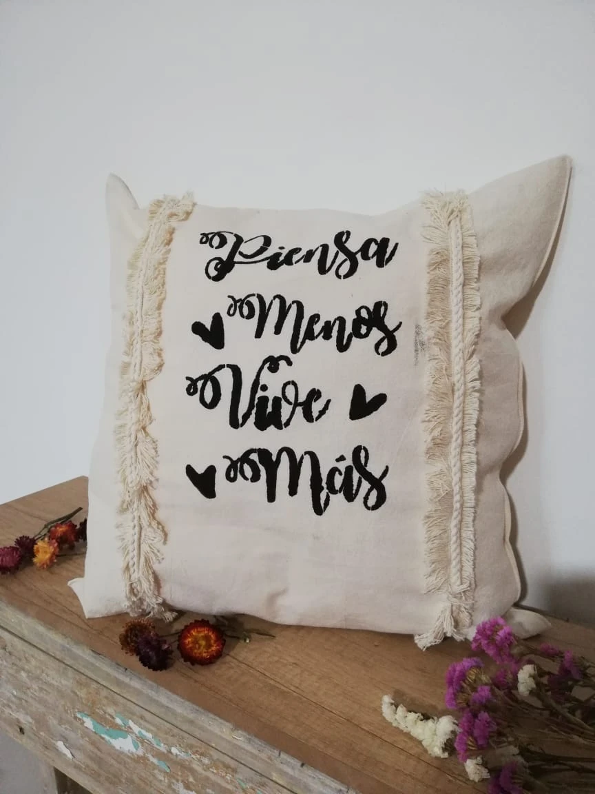 Descubre la comodidad y el estilo con nuestro exclusivo almohadón de tela de tusor en color crudo. Diseño único con detaller estampado y flecos de hilo de algodón. Tamaño ideal de 50x50 para realzar cualquier espacio. ¡Inspira cada día con el mensaje grabado: Piensa menos, vive más!
