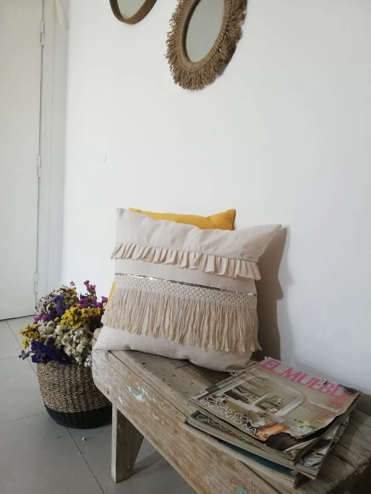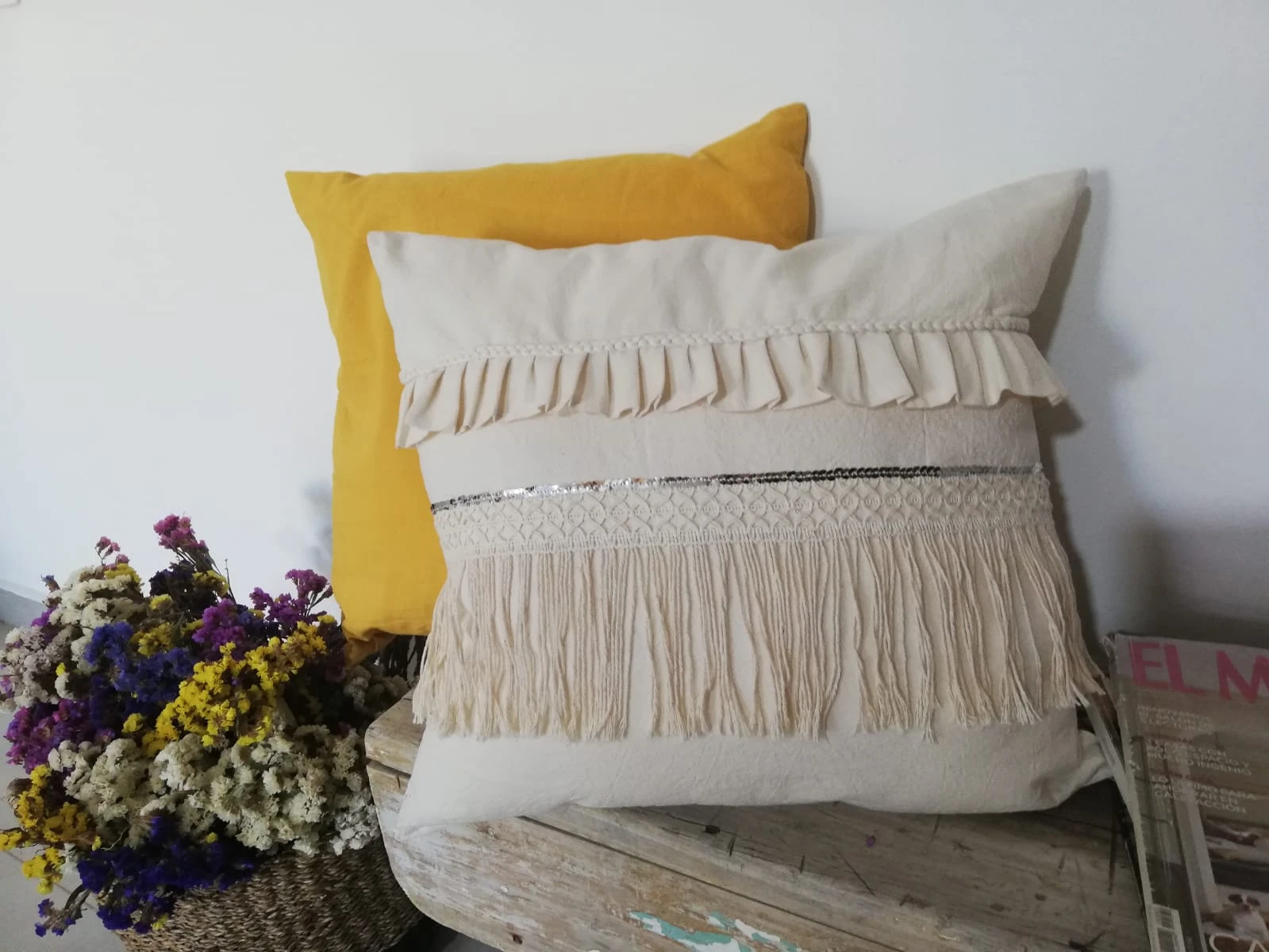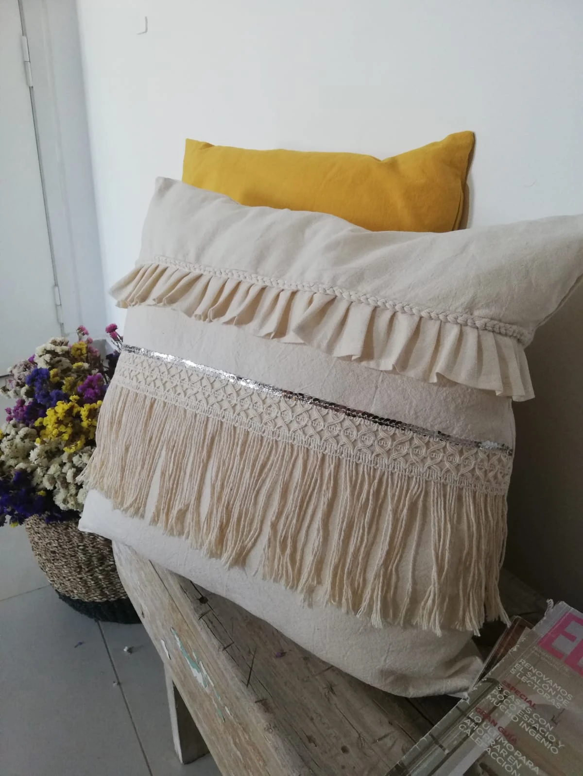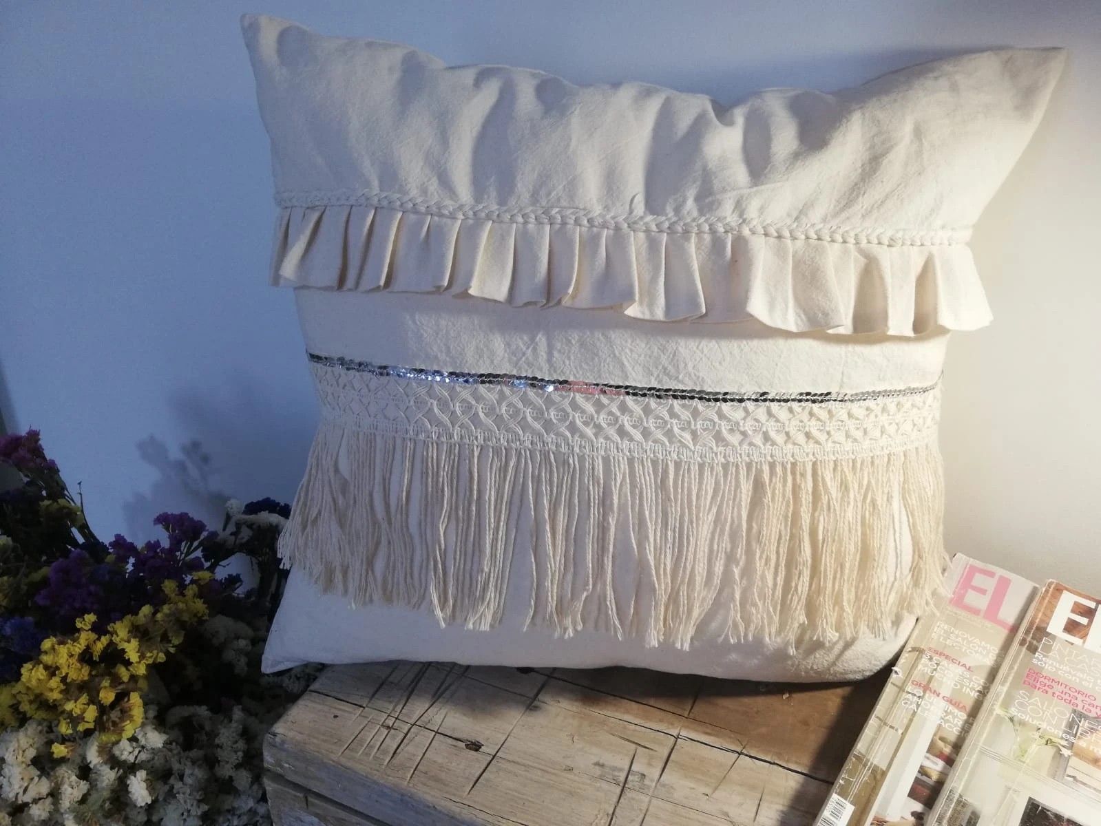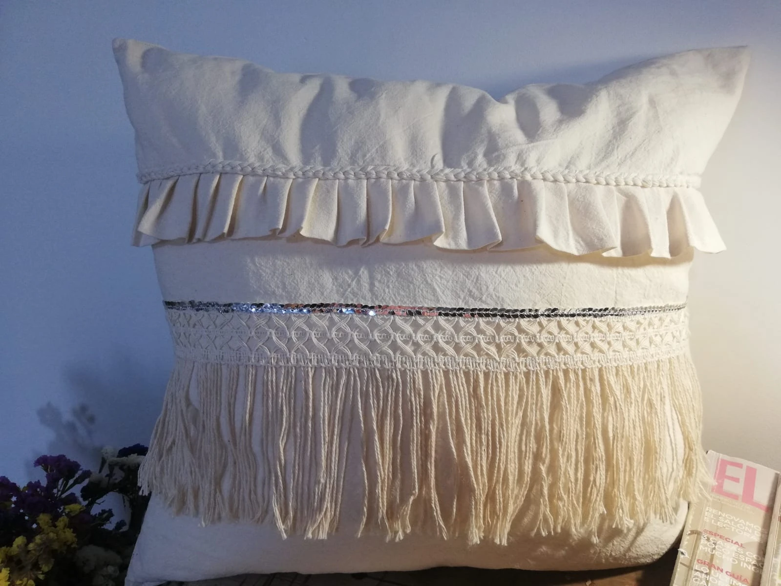 Almohadón modelo "Imperio", confeccionado en tela de tuzor con detalles de bolados, trenzados, flecos y lentejuelas plateadas.