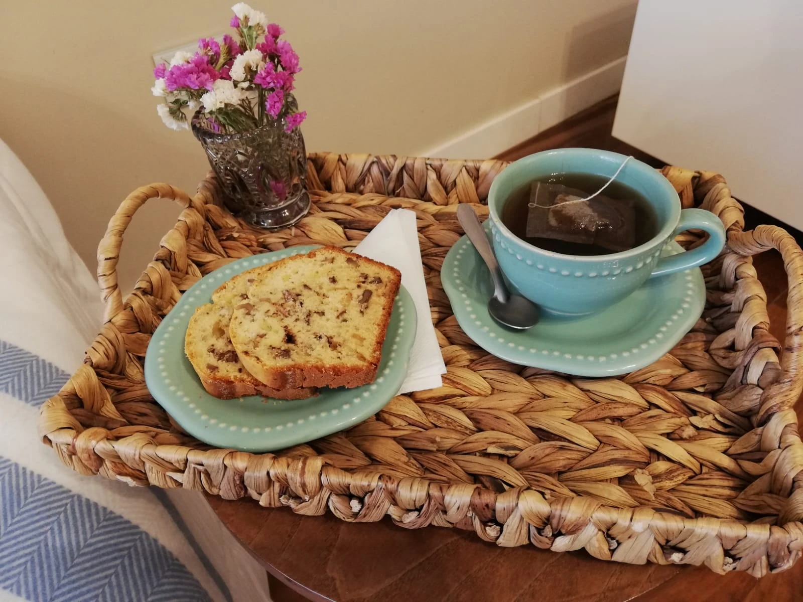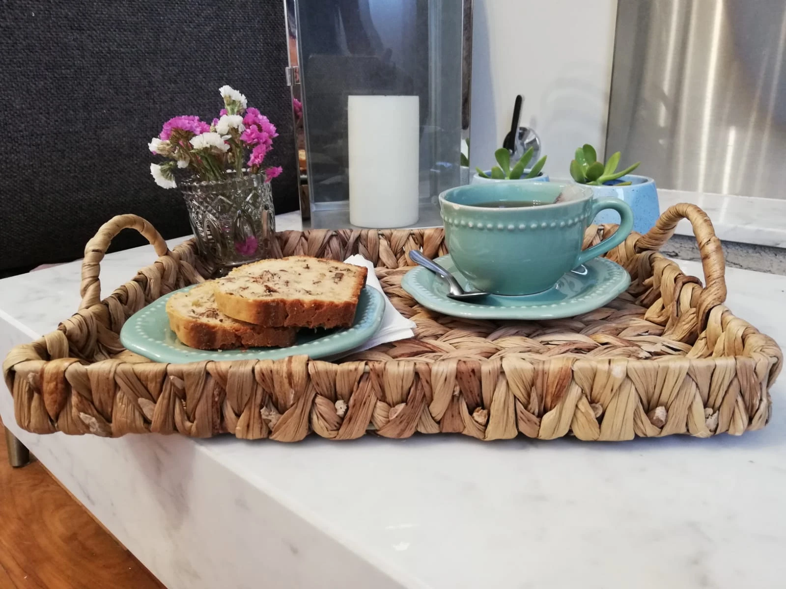 Bandeja de fibras naturales de forma rectangular, en tonalidades marrones. Con manijas