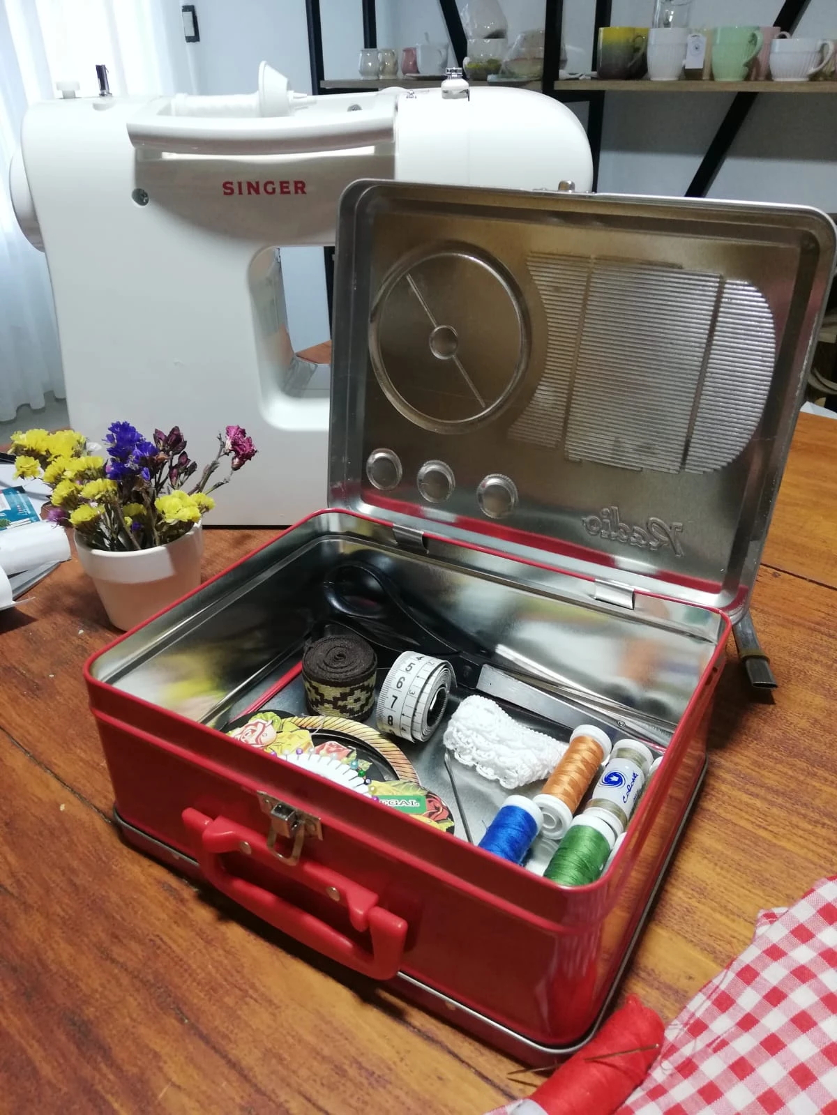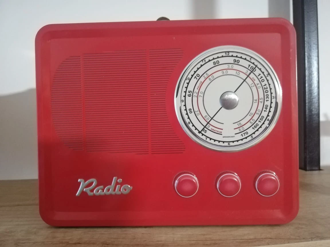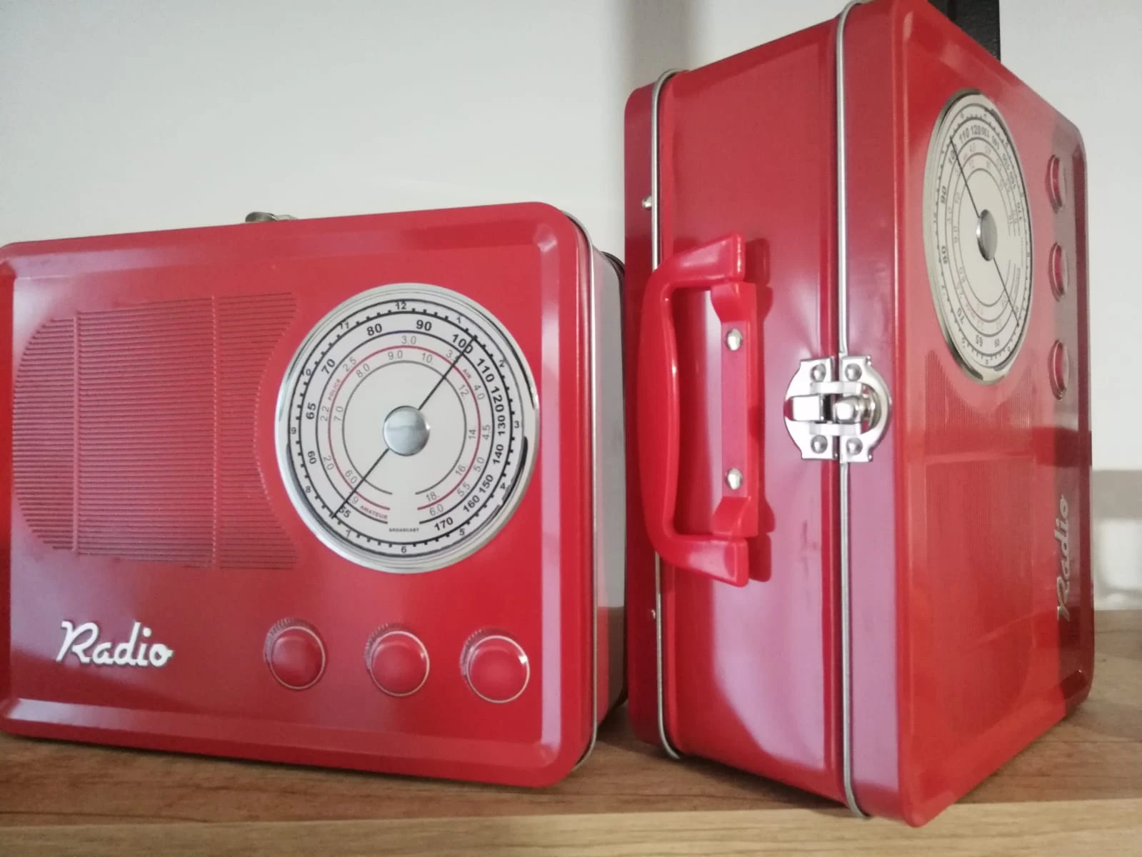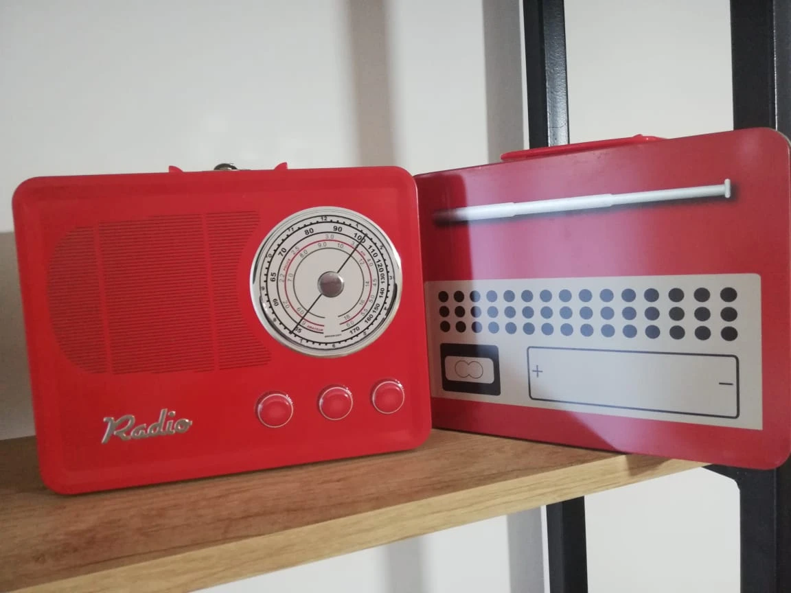 Caja de lata con forma de radio, color rojo. Con tapa de cierre estilo maletín. Mide 22 x 17 x 9 cm .