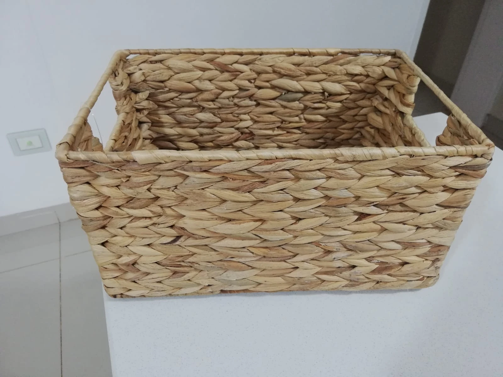 Canasto organizador, confeccionado en fibras naturales y alambre.