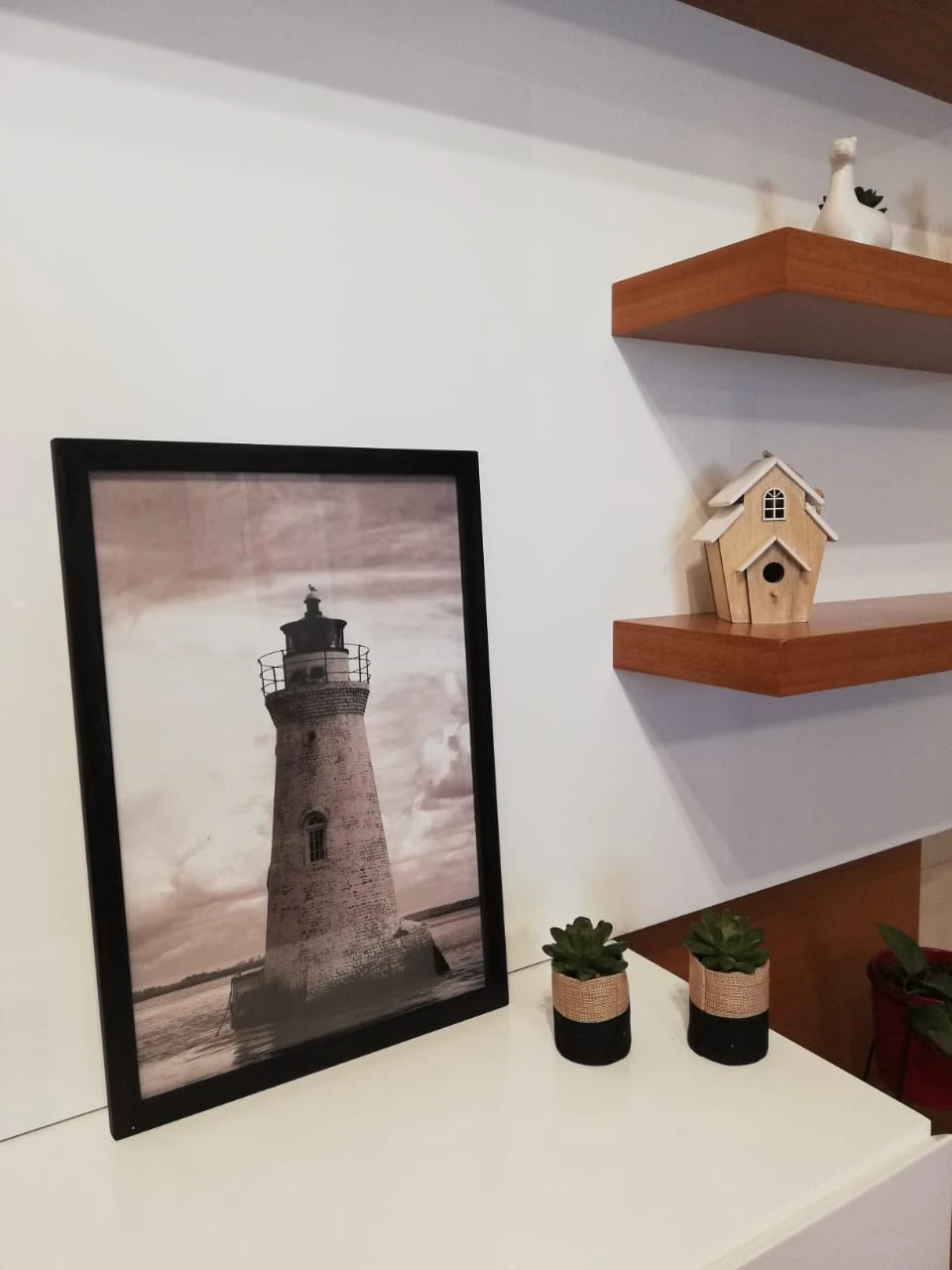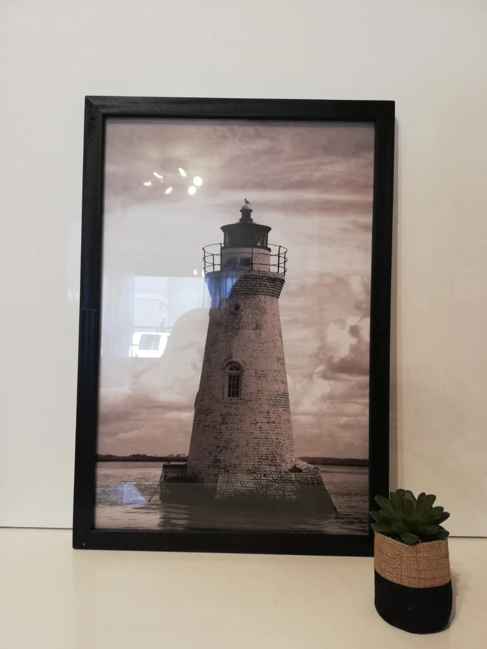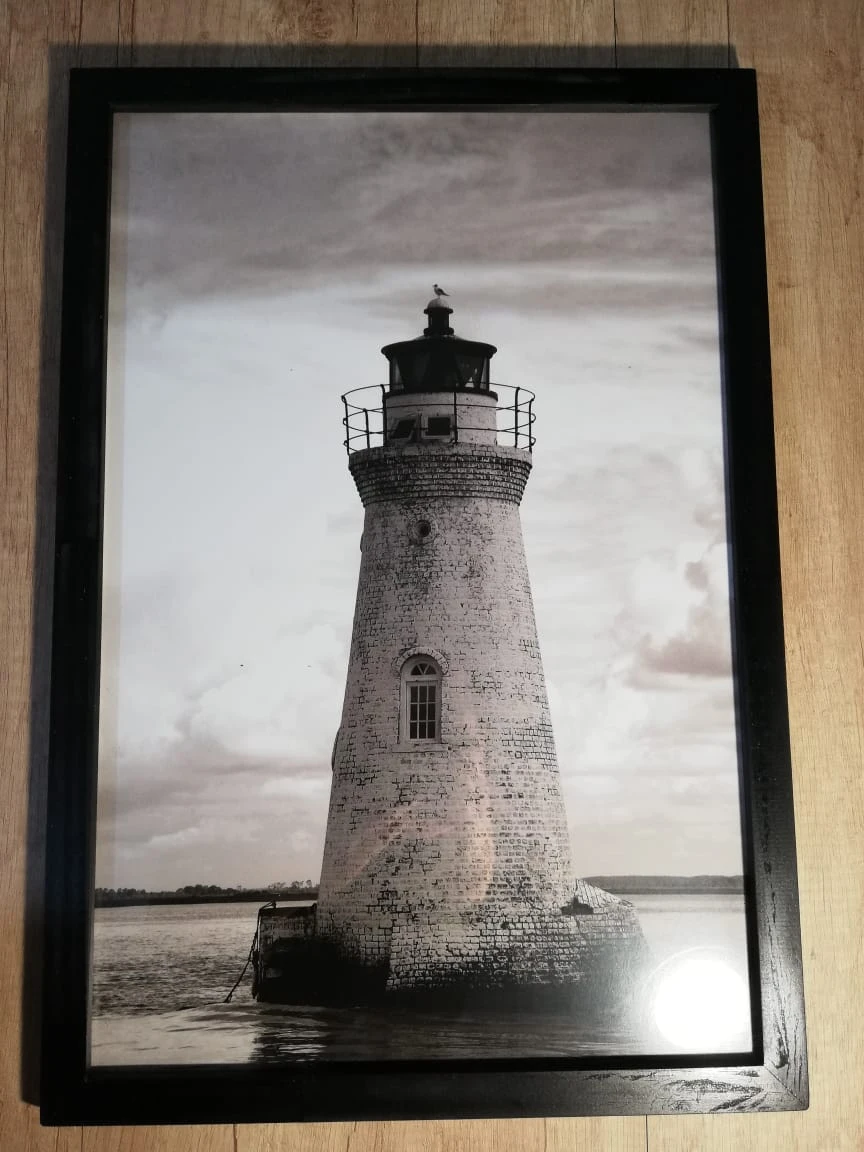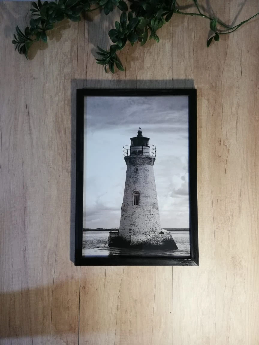 Cuadro "El Faro" de 45 x 30 cm. Con lamina en blanco y negro. Marco de madera de varilla chata en color negro, vidrio float de 2,2 mm de y soporte de MDF de 3mm. Con gancho para colgar.