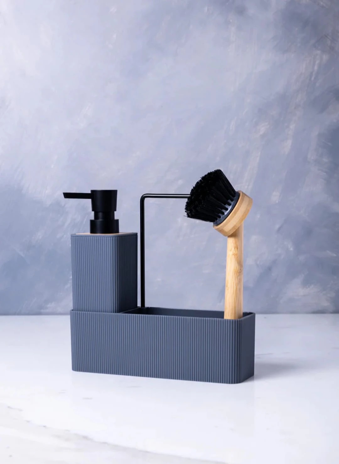 Dispenser para detergente de 420 ml, con base contenedora, cepillo para fregado, soporte para paño y esponja.