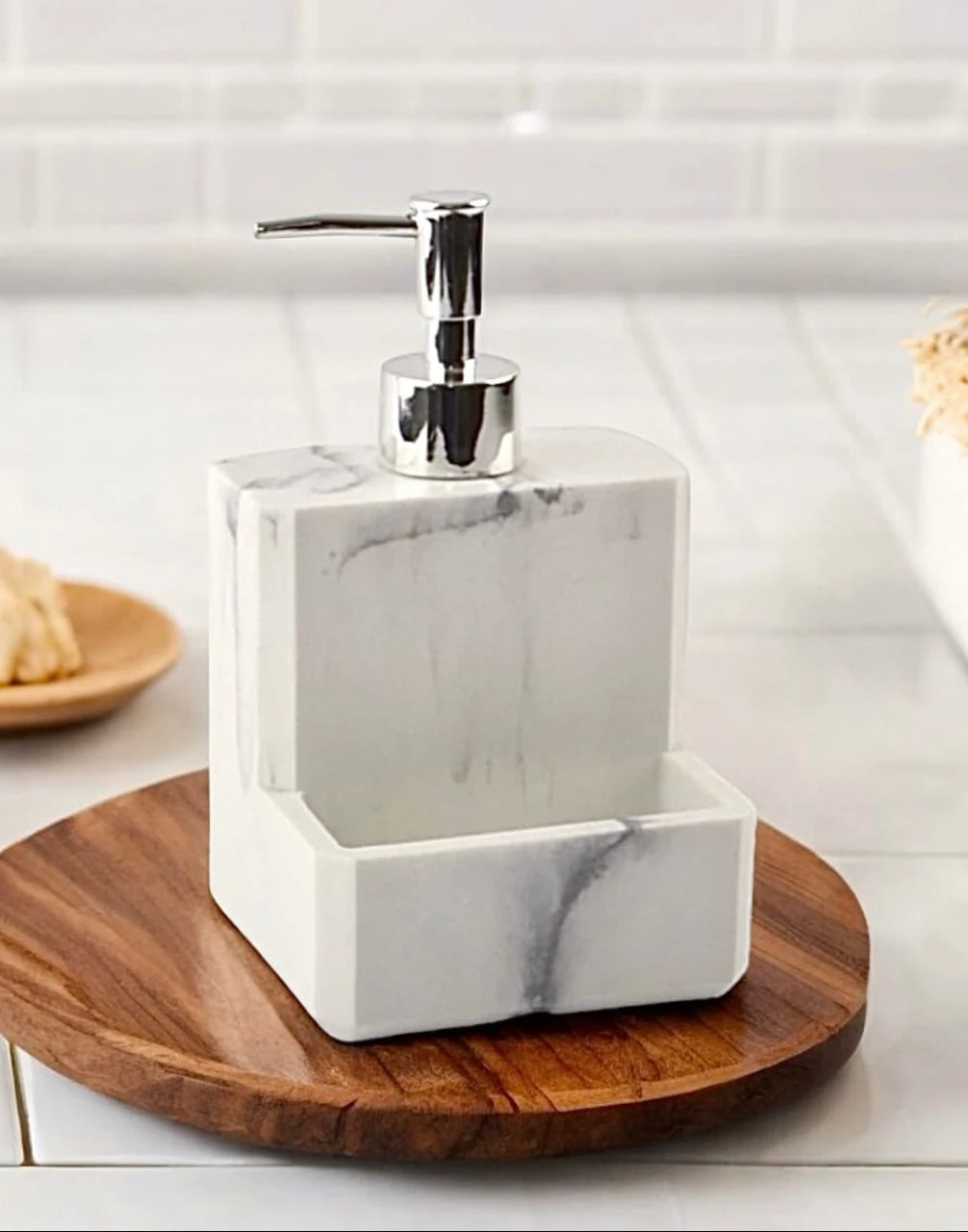 Dispenser de detergente de resina simil mármol con porta esponja.