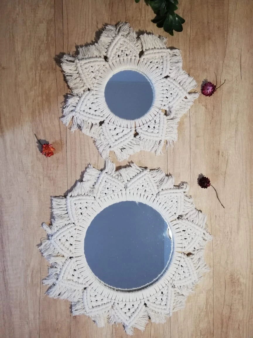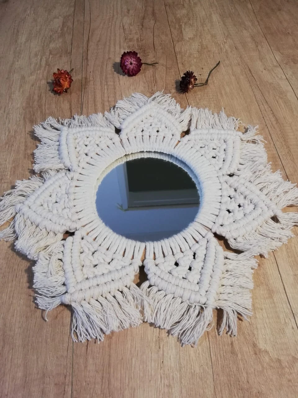 Espejo tejido en hilo de algodón beige con técnica de macramé. De 30 cm de diámetro (incluyendo el marco tejido).