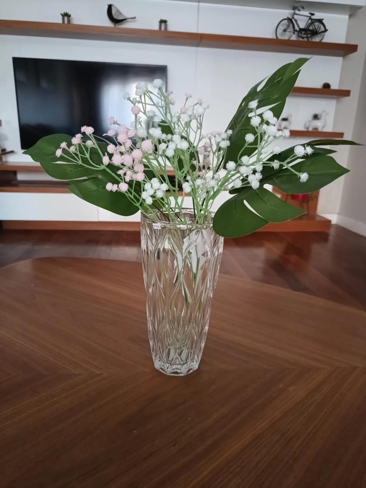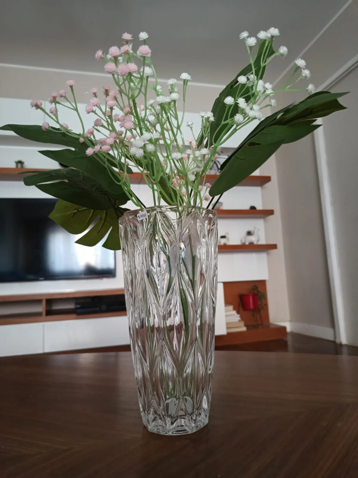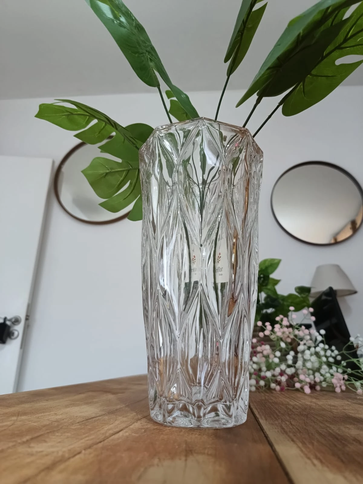 Florero de vidrio de 24 cm de alto, 13 cm de diámero en la boca y 8 cm de diámetro en la base.
