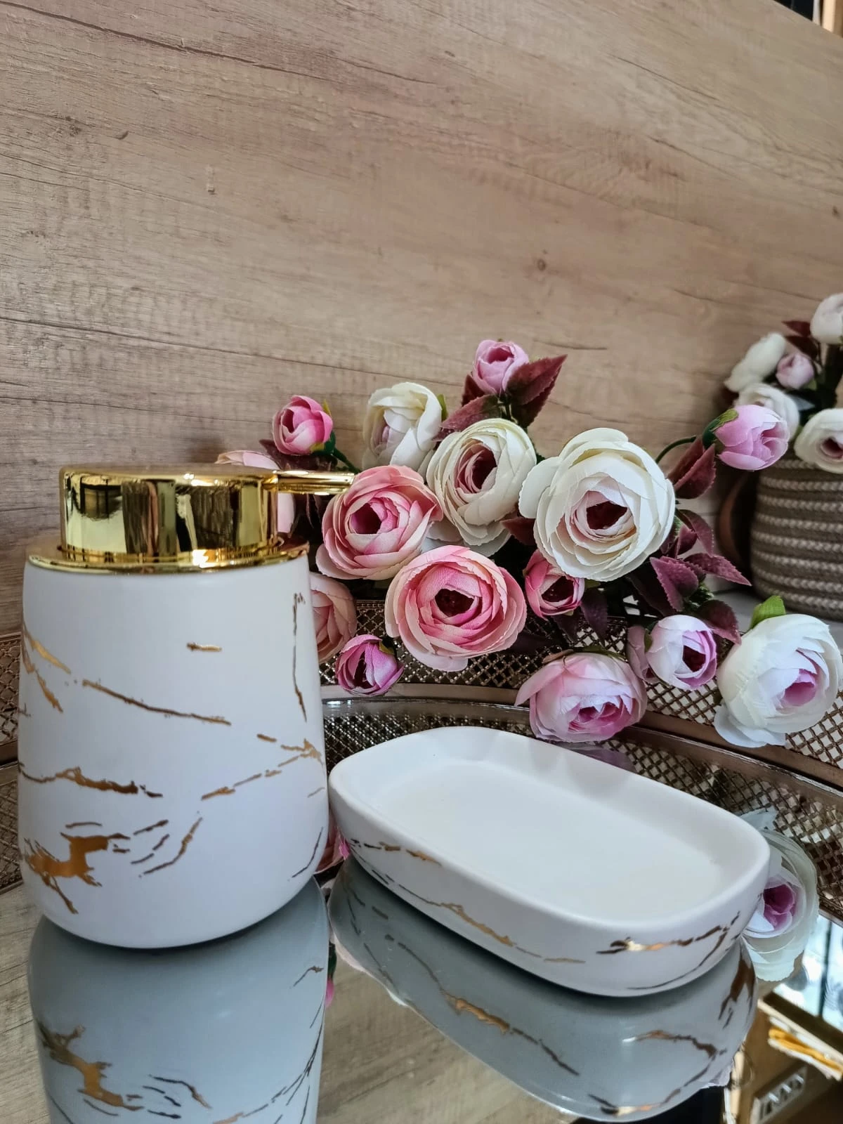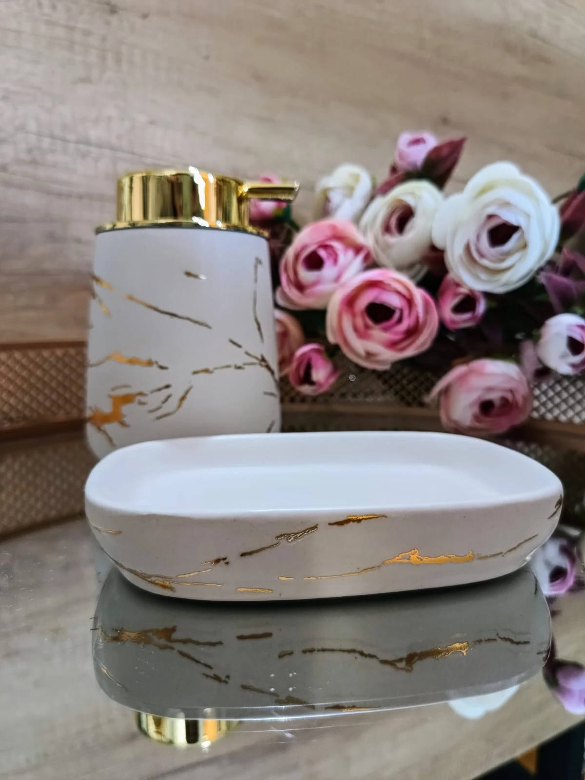 Jabonera de cerámcia blanca con detalles dorados.
