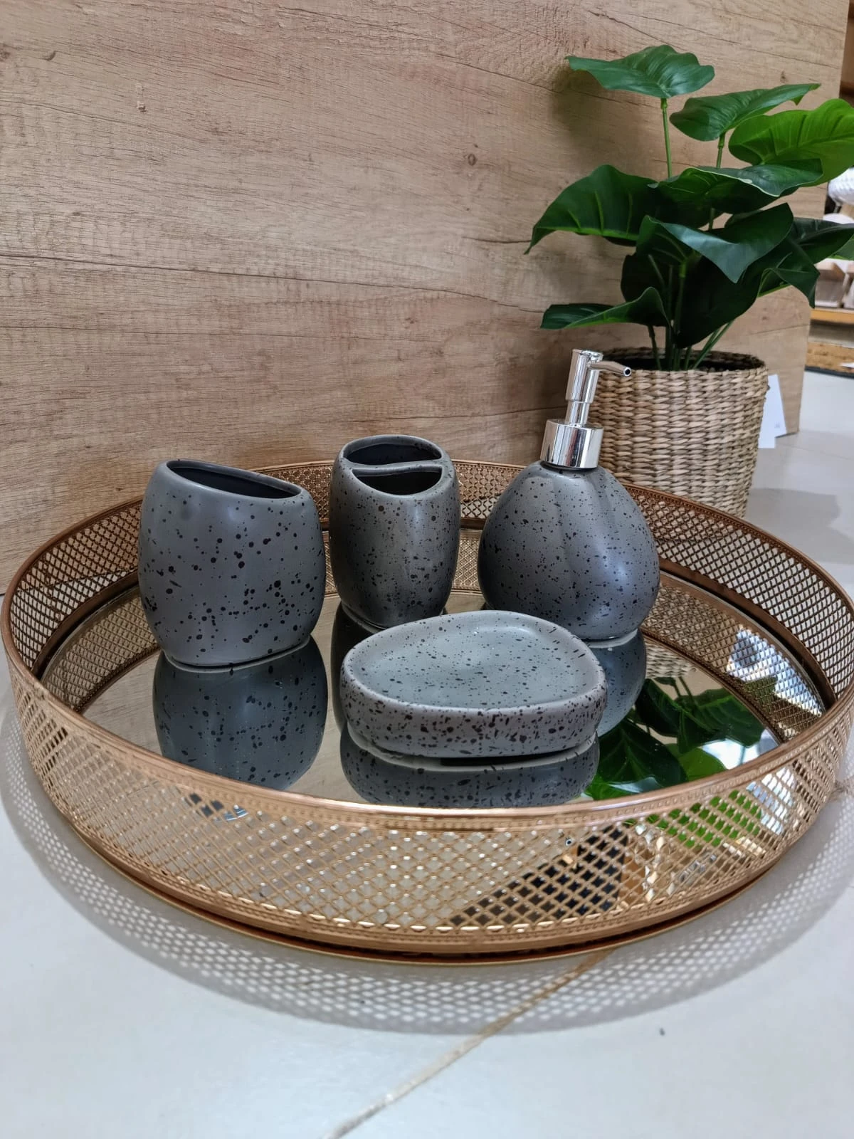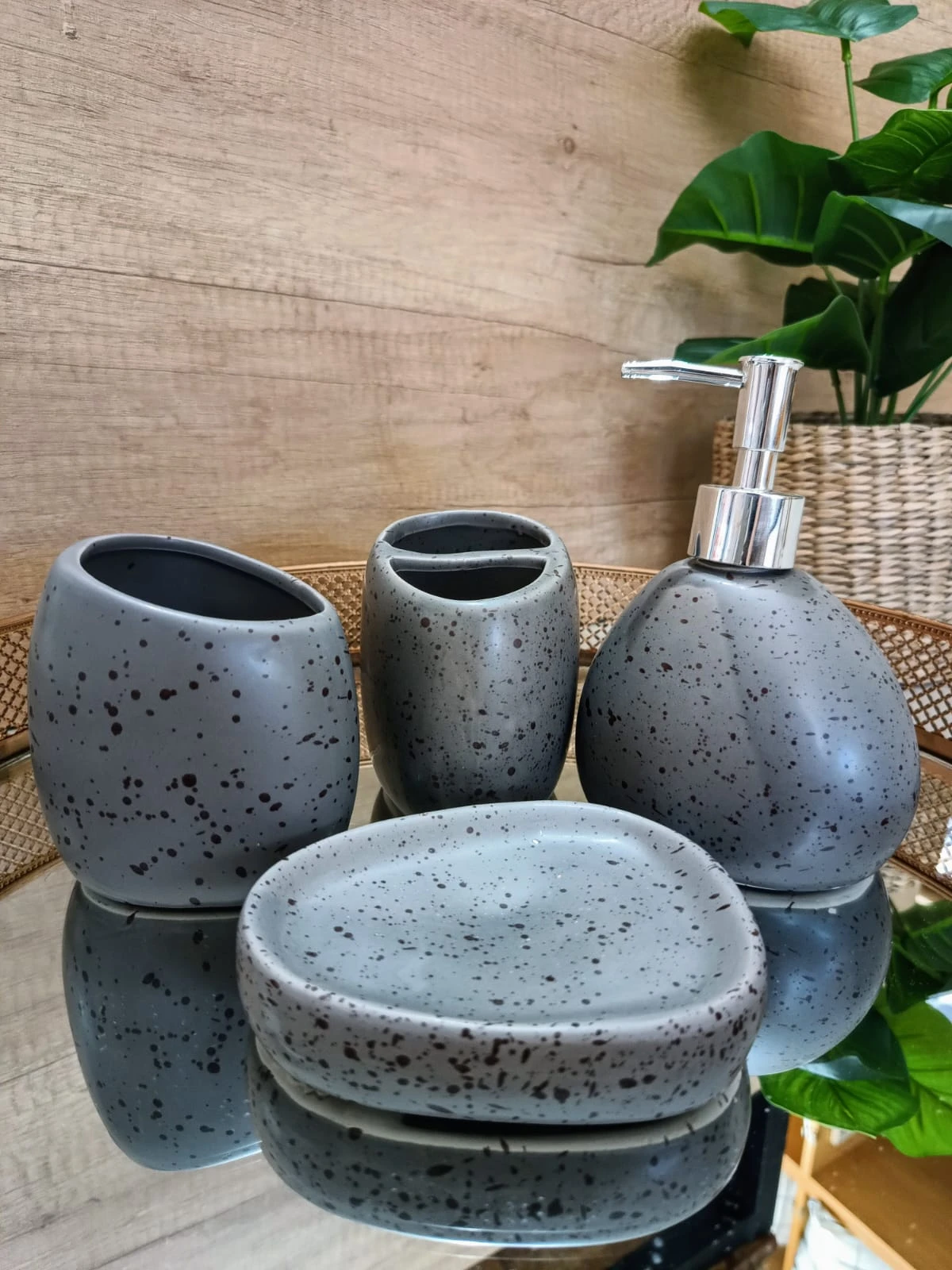 Se compone de cuatro piezas: dispenser de jabón, portacepillos, vaso multiuso y jabonera.