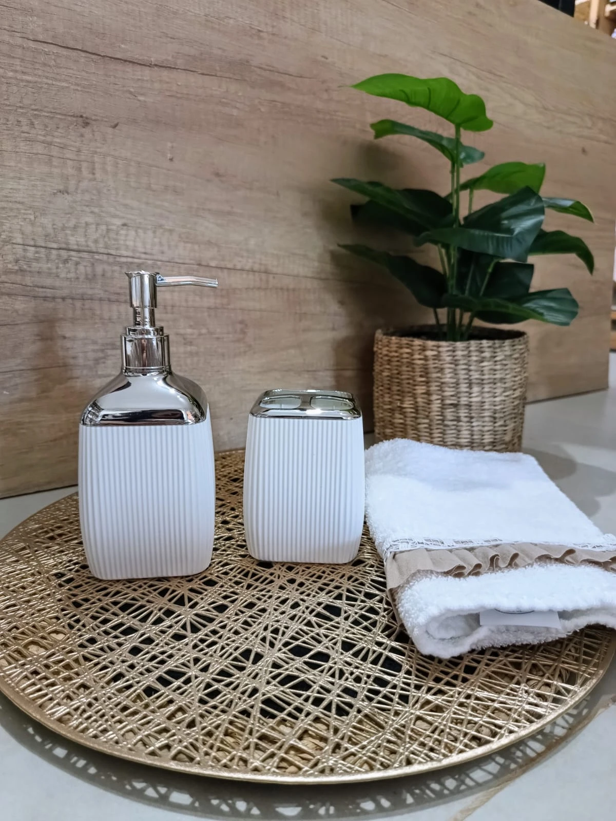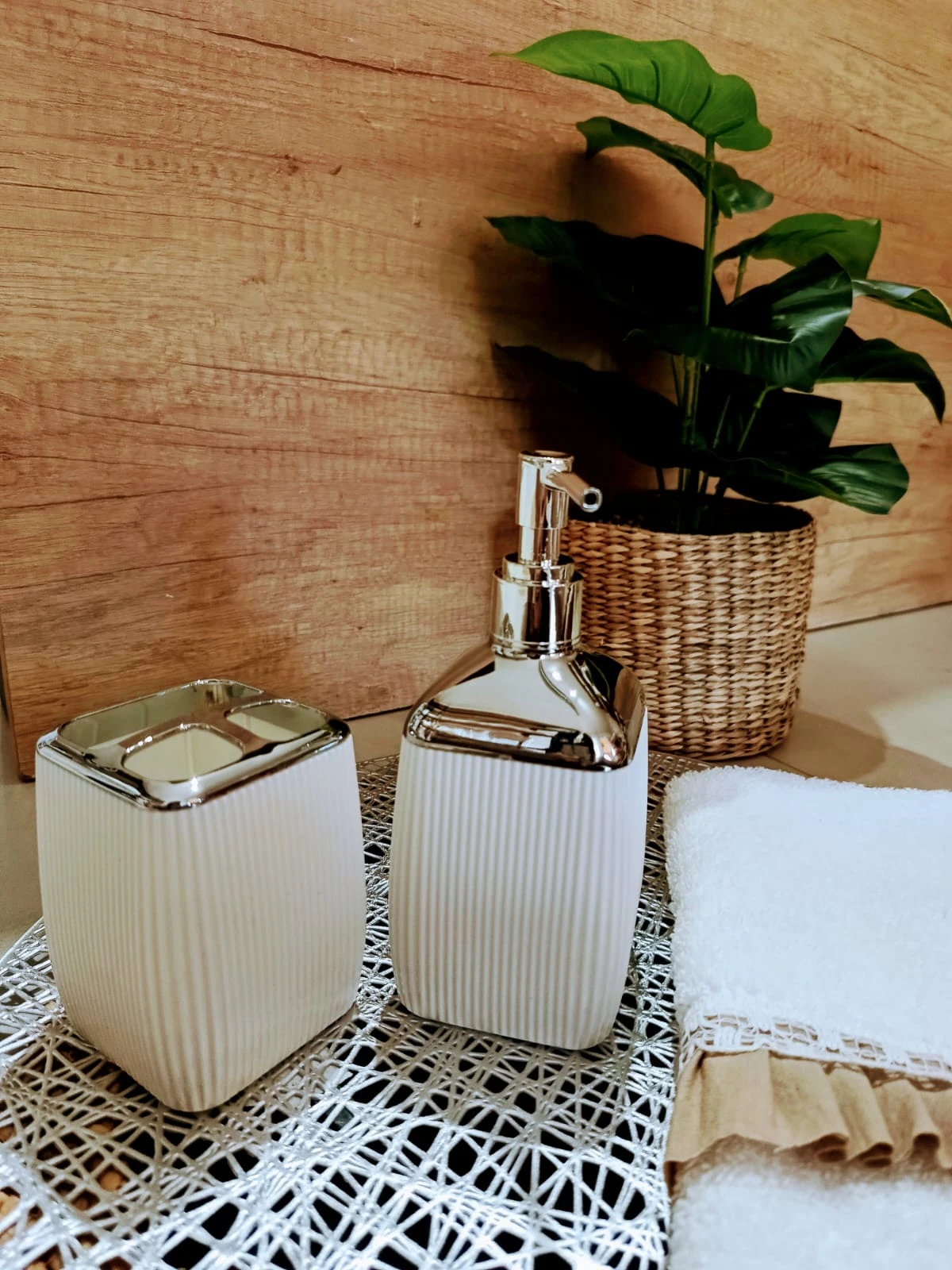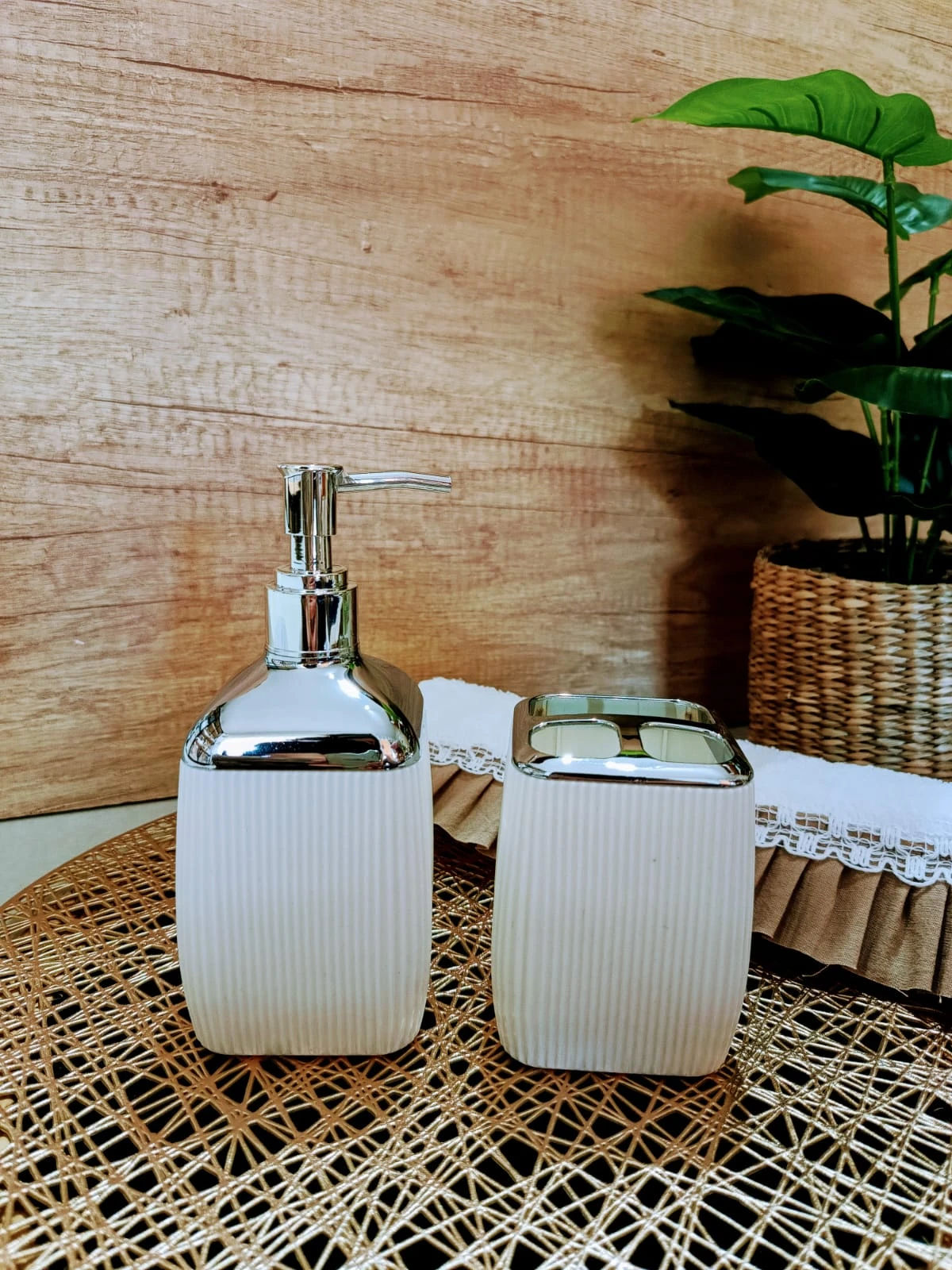 Juego de accesorios para baño compuesto por dos piezas: Dispenser de jabón y portacepillo.