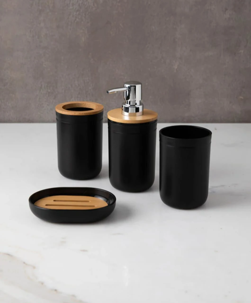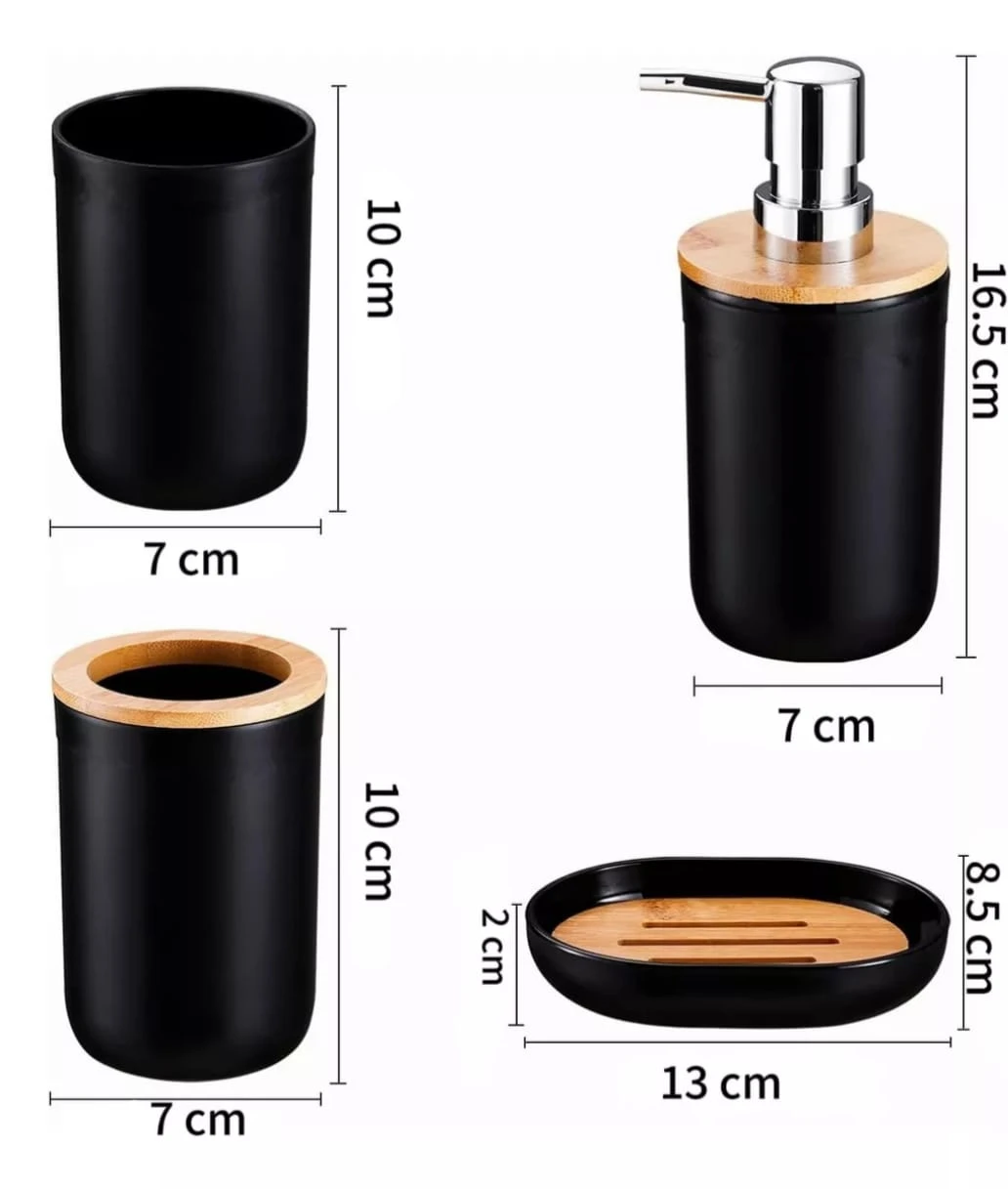 Juego de baño de cuatro piezas: dispenser, vaso multiuso, portacepillo y jabonera.