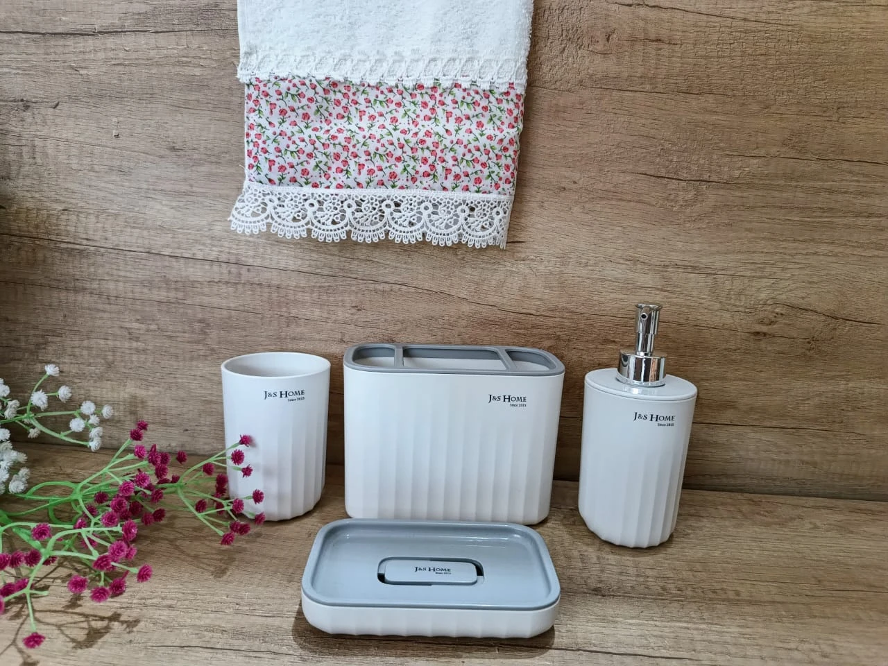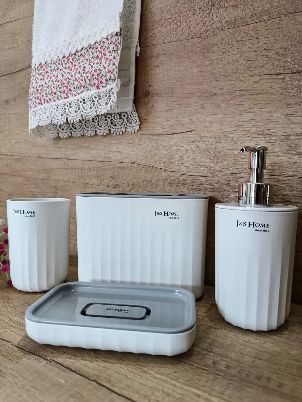 Juego de baño de cuatro piezas: organizador de cepillos, jabonera, vaso multiuso y dispenser.