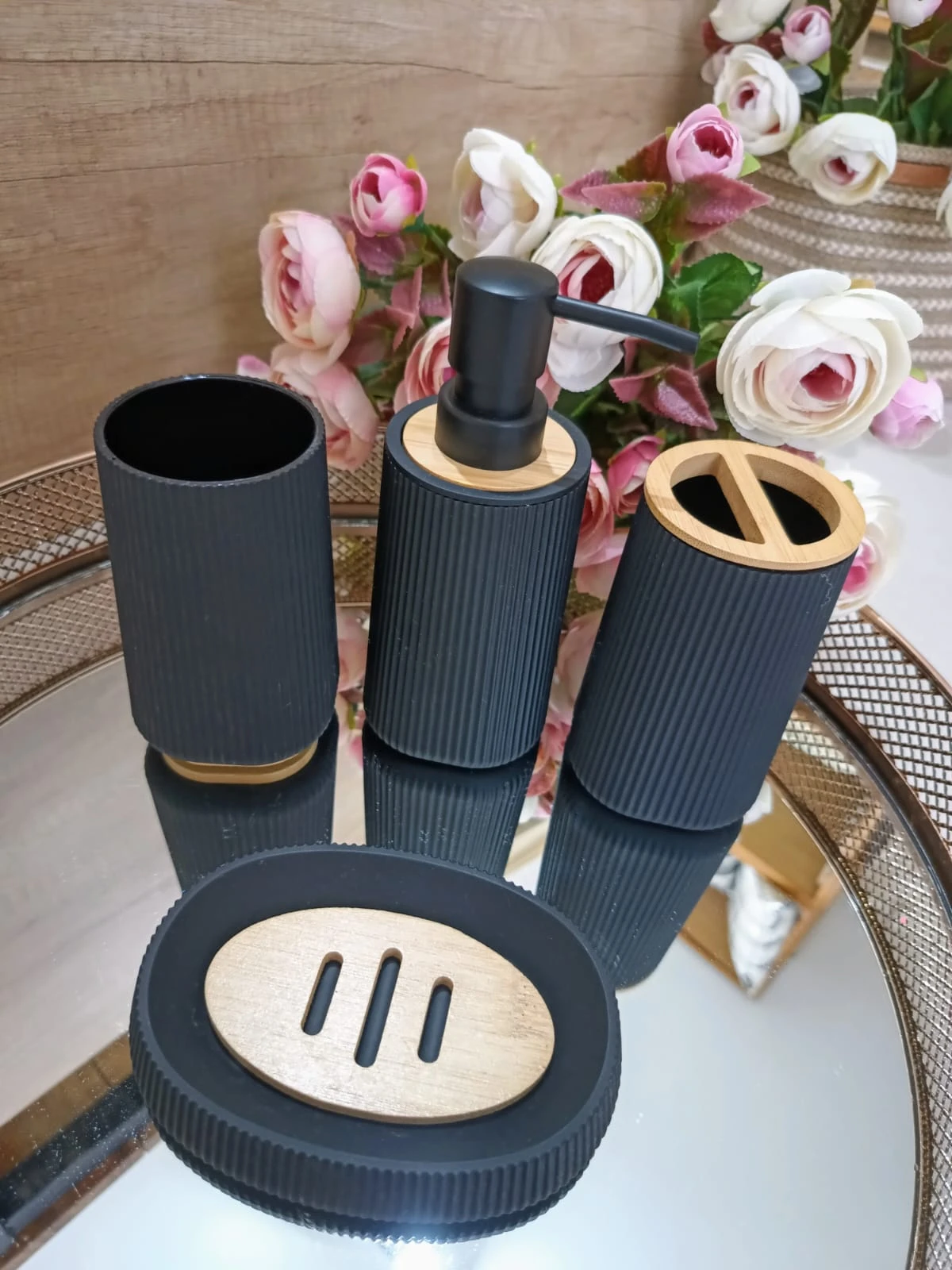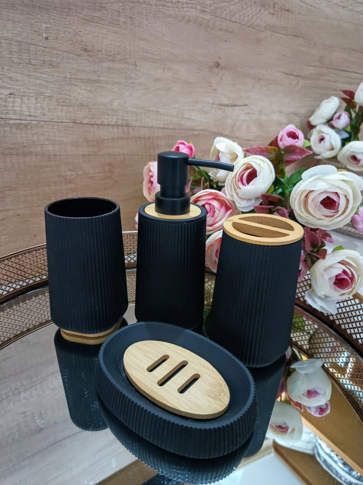 Juego de accesorios de baño de cuatro piezas. Se compone de dispenser de jabón líquido, vaso multiuso, portacepillos y jabonera.