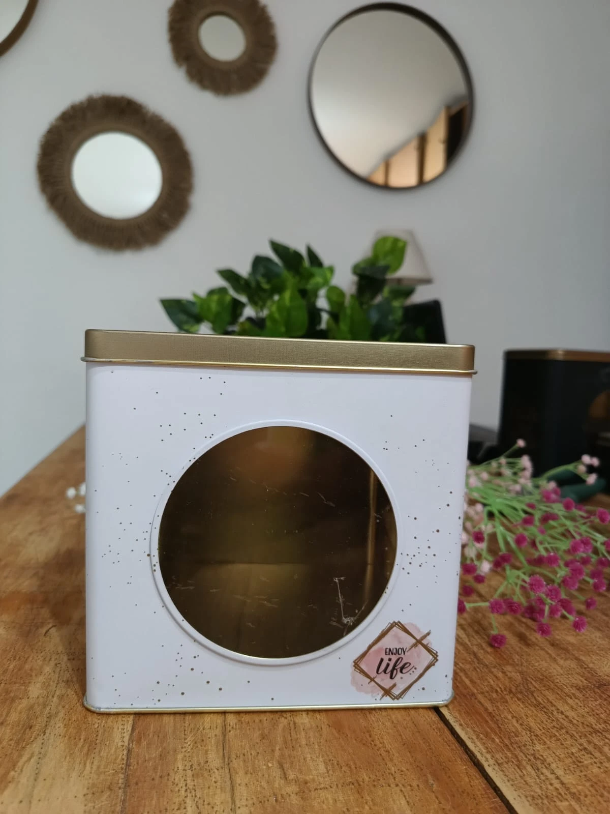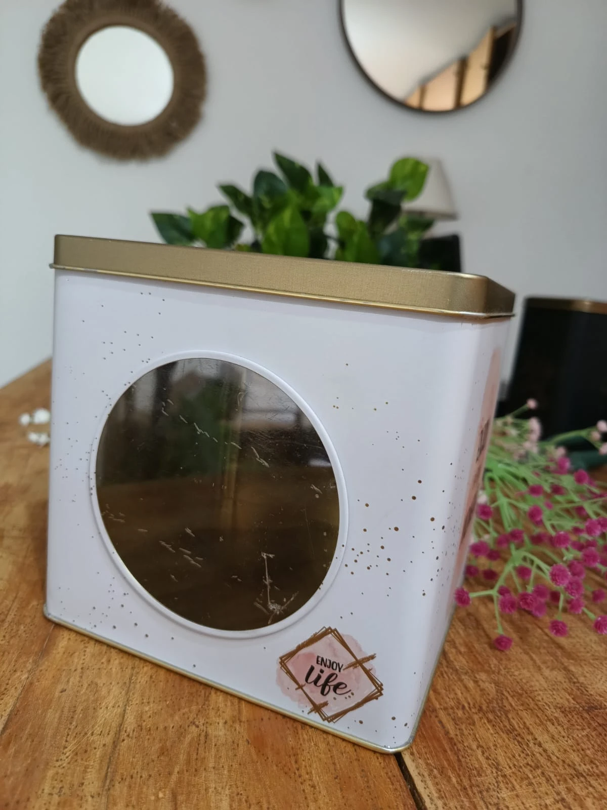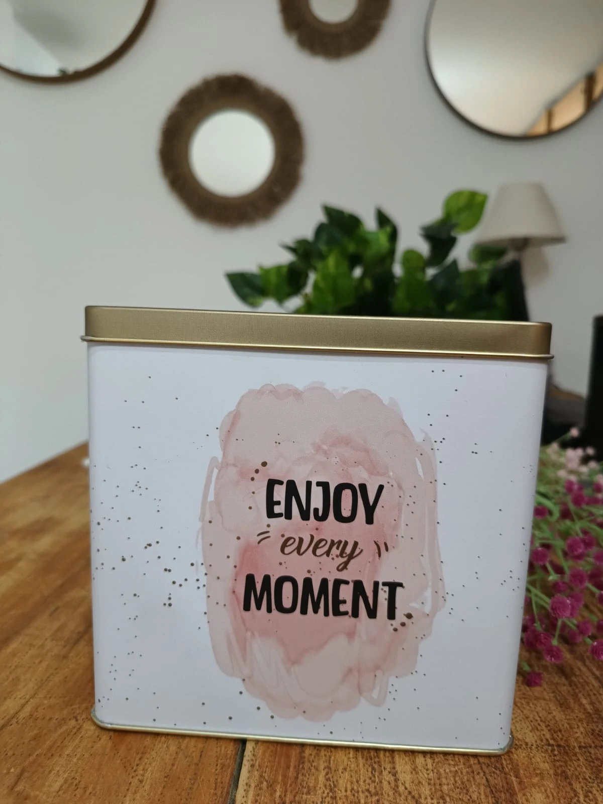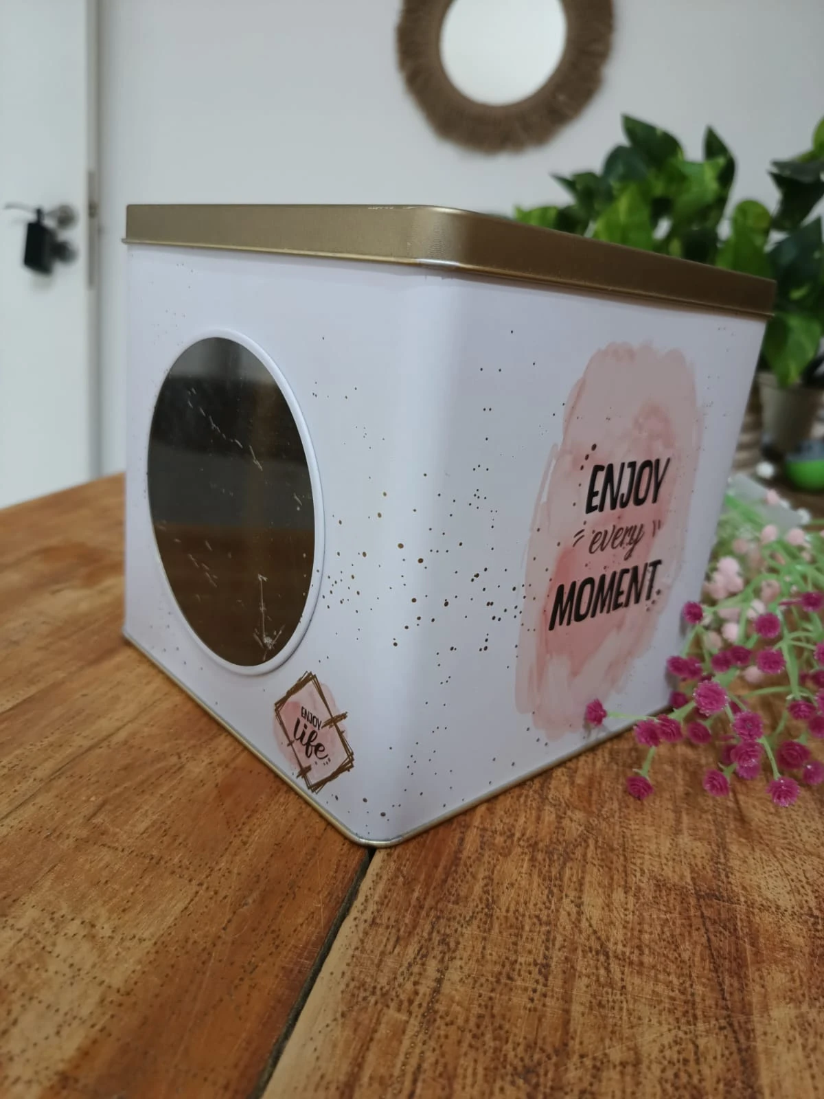 Es una lata cuadra de base blanca con detalles decorativos en tonalidades rosas y escricrituras de color negro (enjoy every moment). Tiene visor transparente.