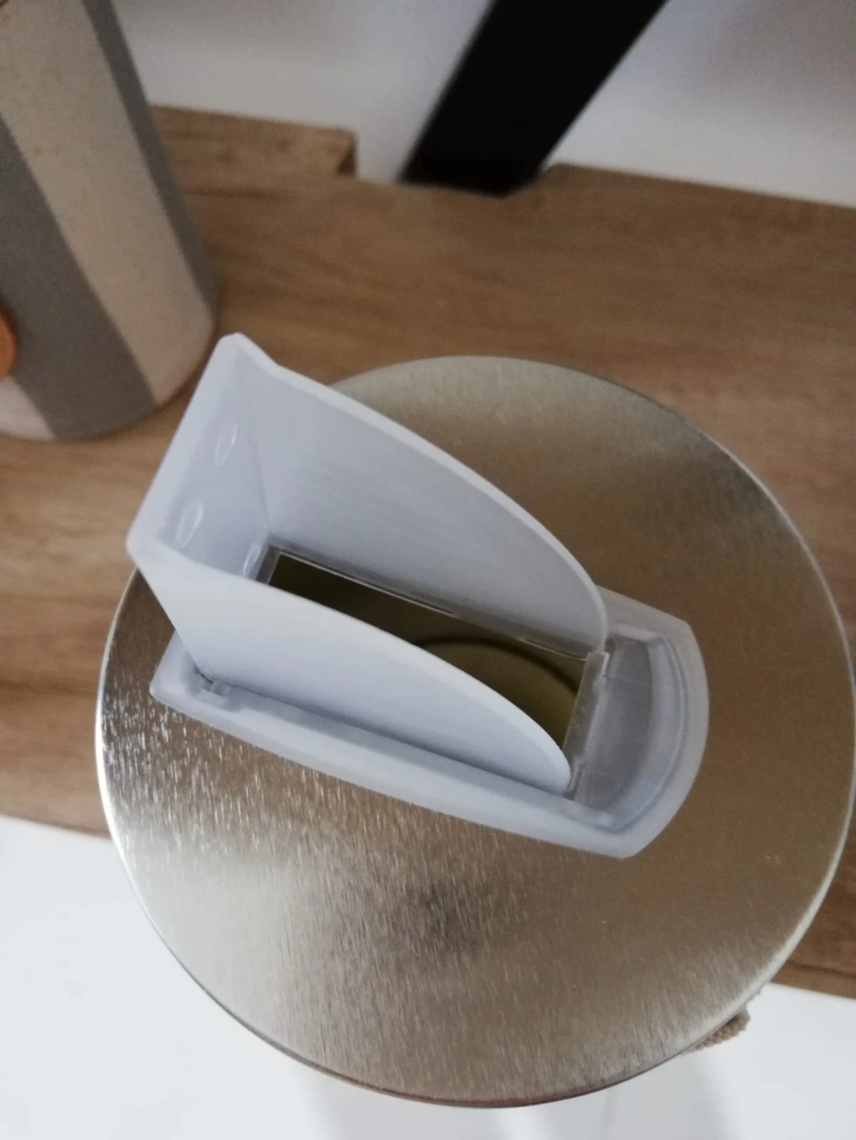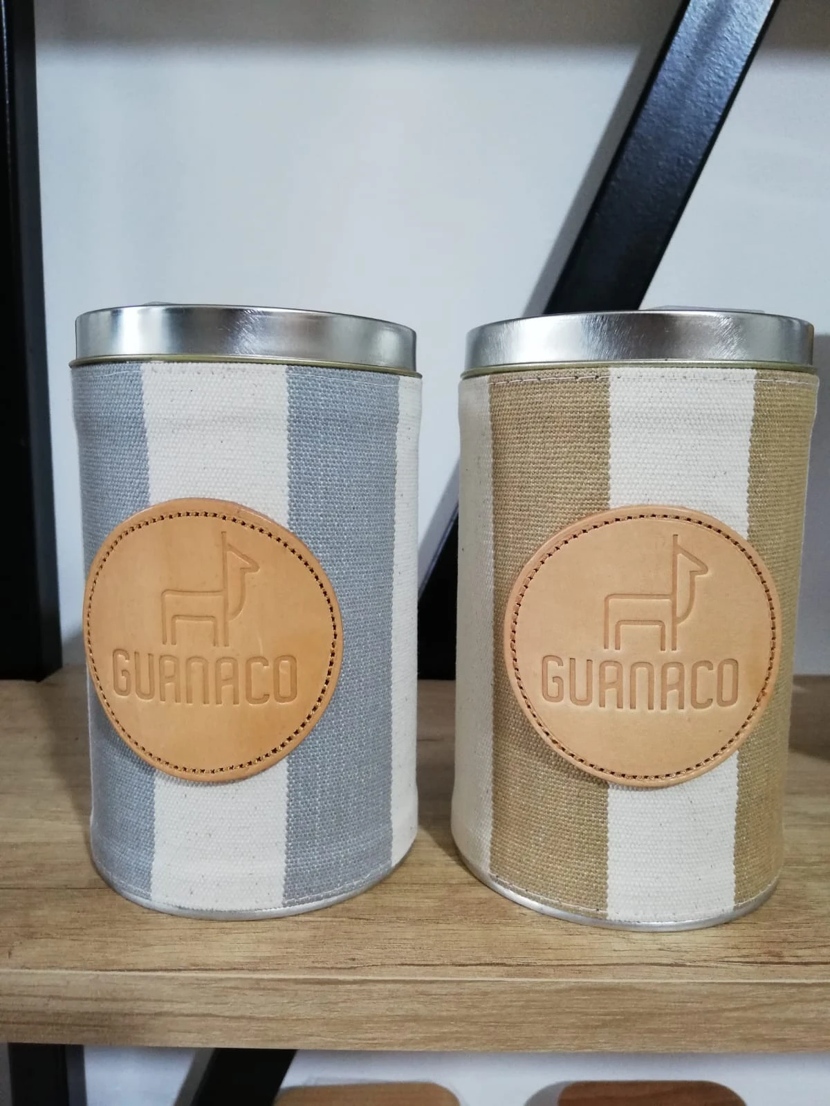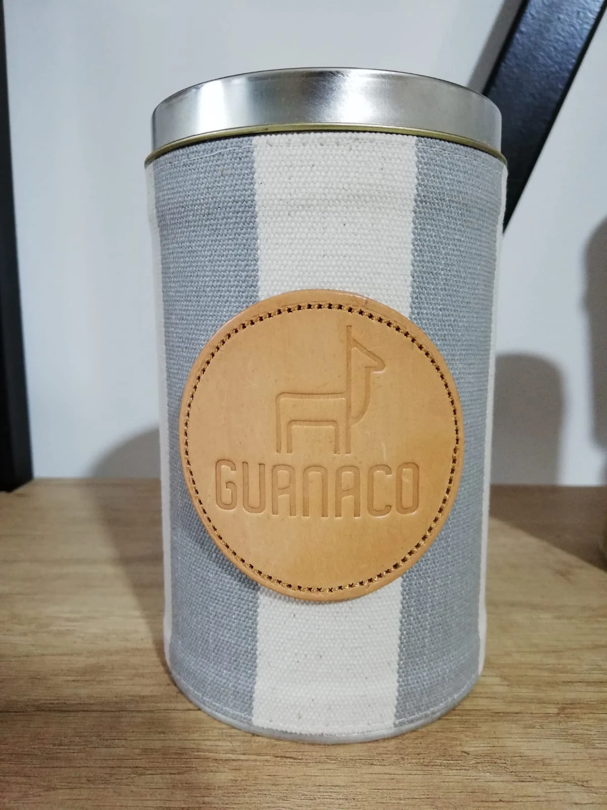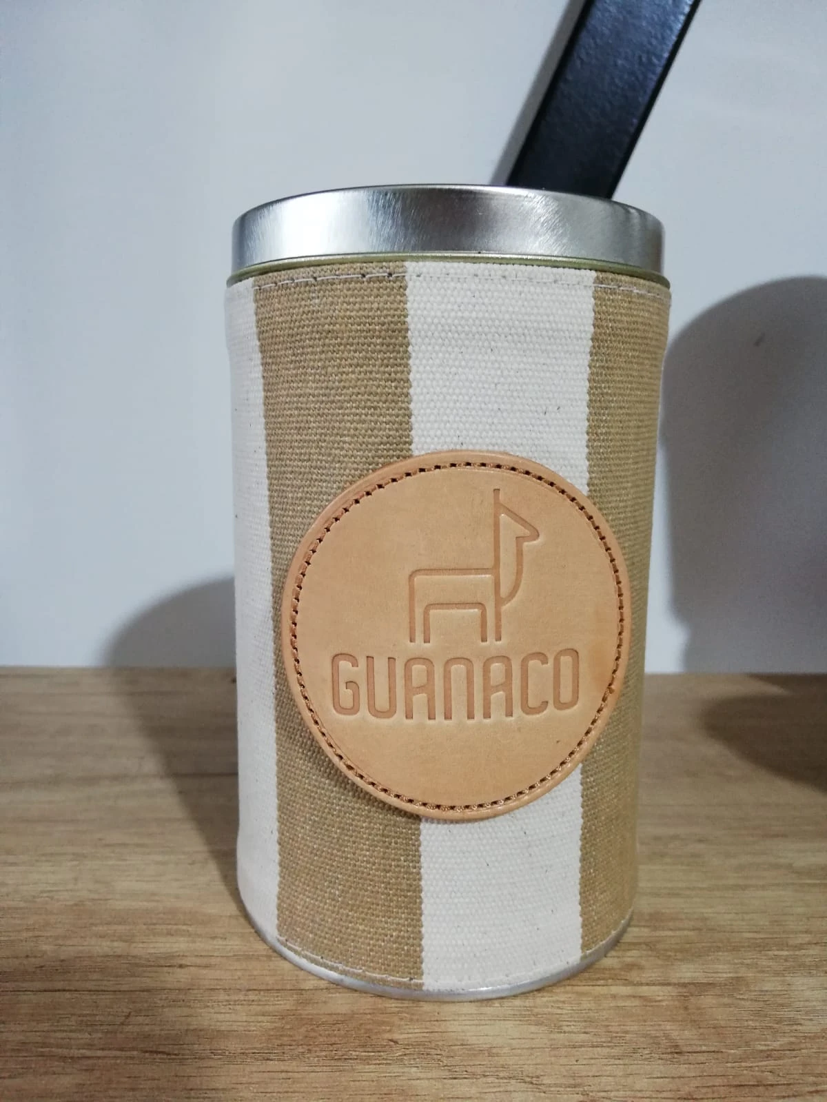 Lata yerbera forrada en tela de gabardina a rayas, con pico vertedor plástico.