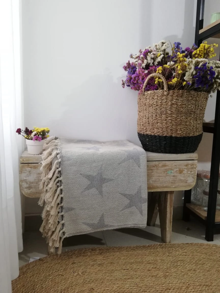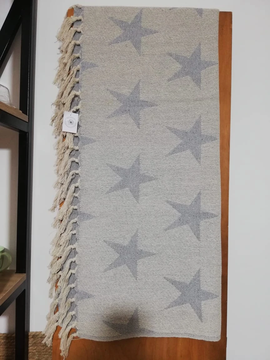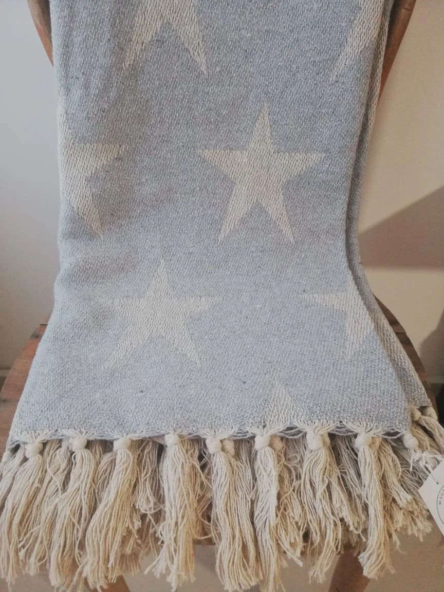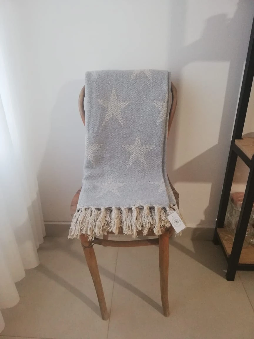 Manta decorativa de algodón con base de color gris, detalle de estrellas gris claro y flecos en los extremos.