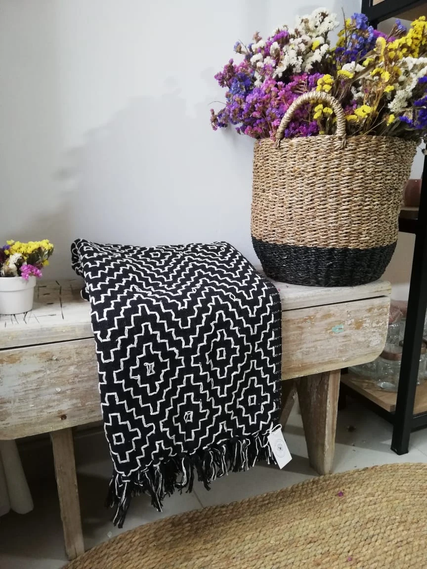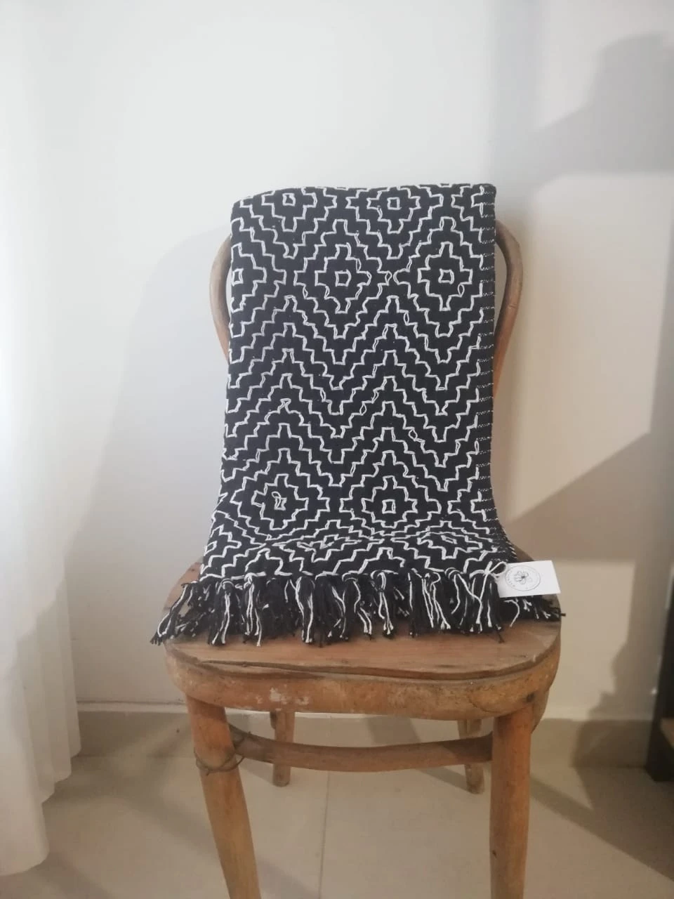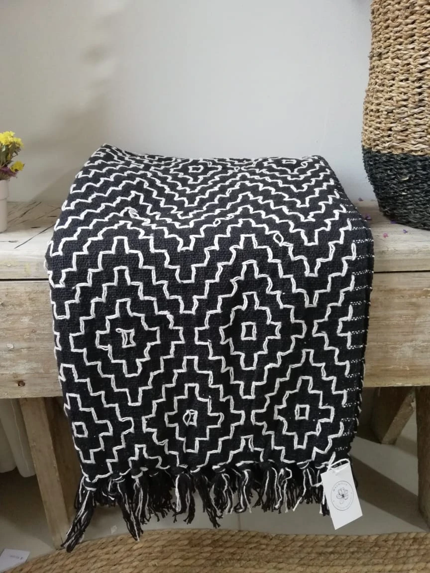 Manta de algodón tramada de base negra, con rombos grandes de color blanco y flecos