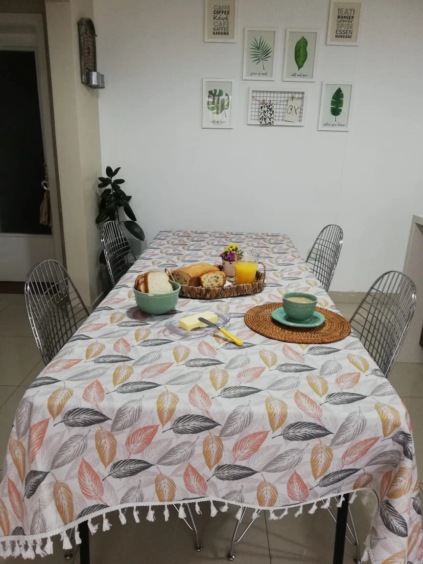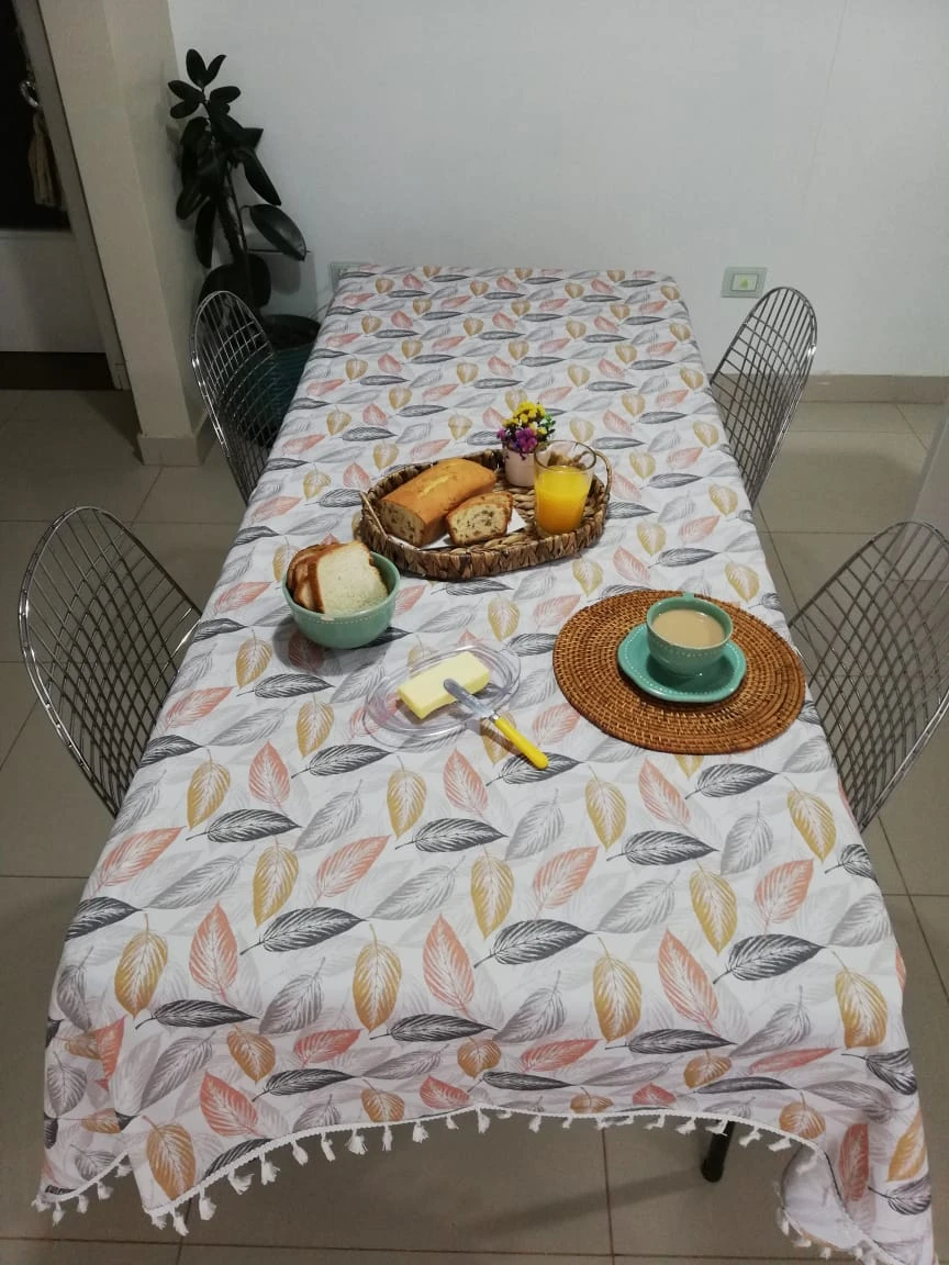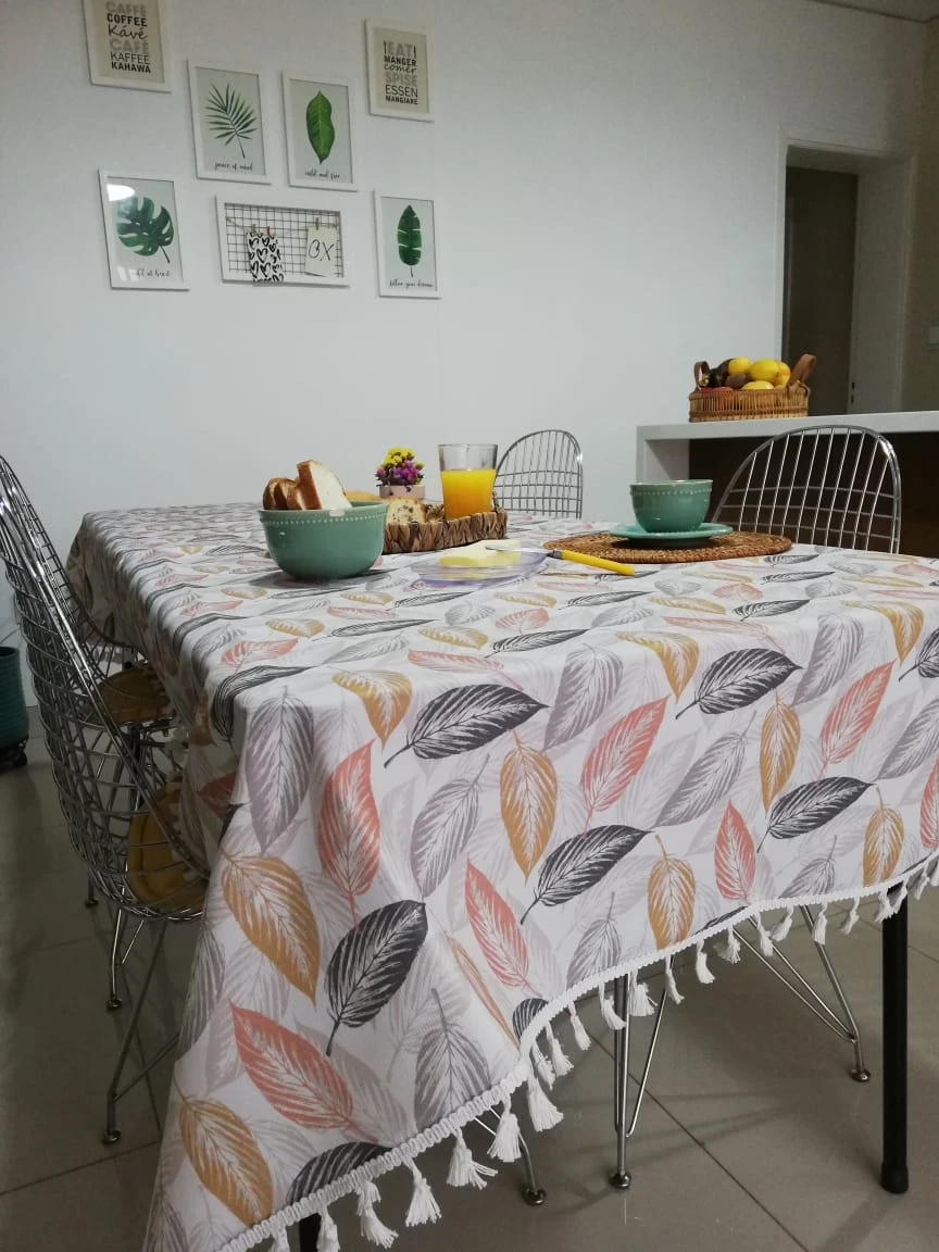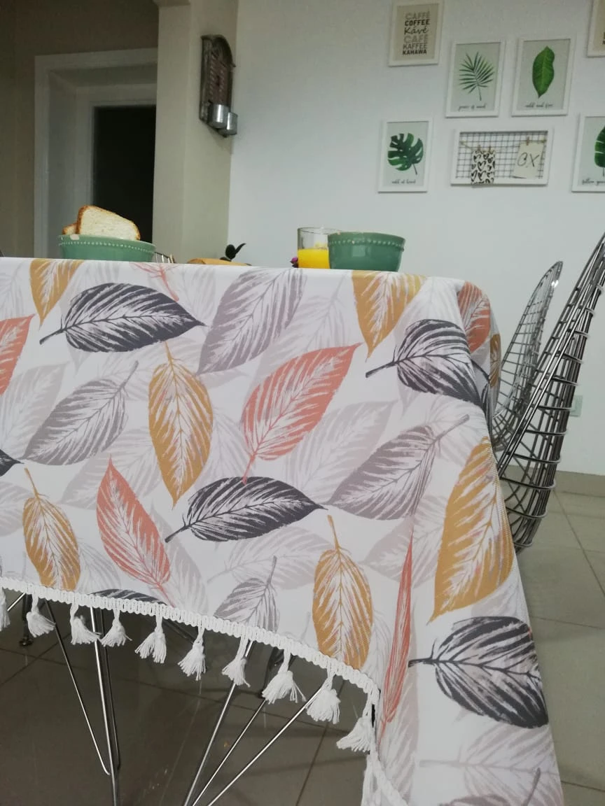 Mantel "Antiderrame" confeccionado en gabardina acrílica, con hermoso estampado de hojas otoñales y con detalles de puntilla y flecos de algodón blanco en todo el contorno. Mide 2 X 1,5 mts. Apto para lavarropa.