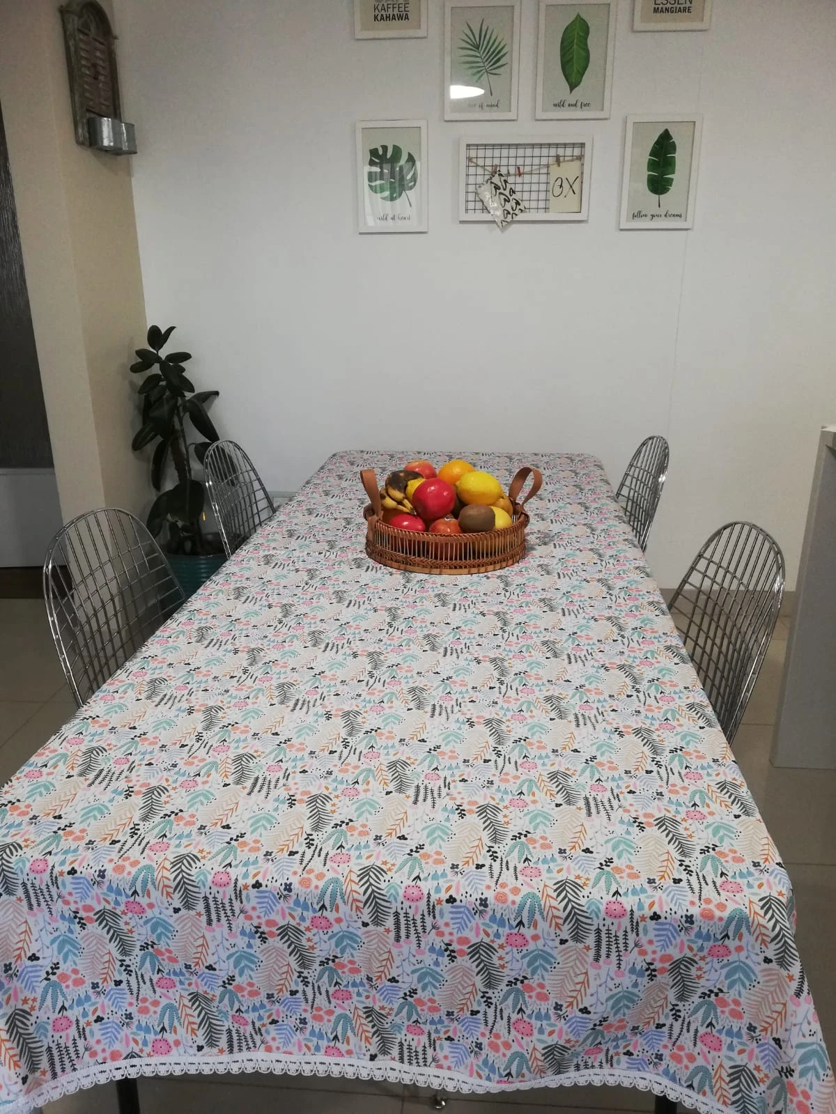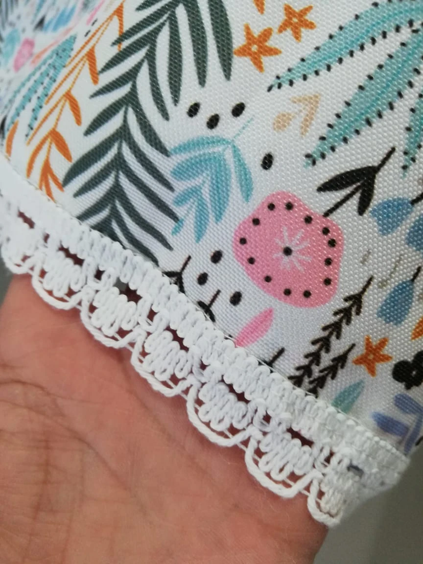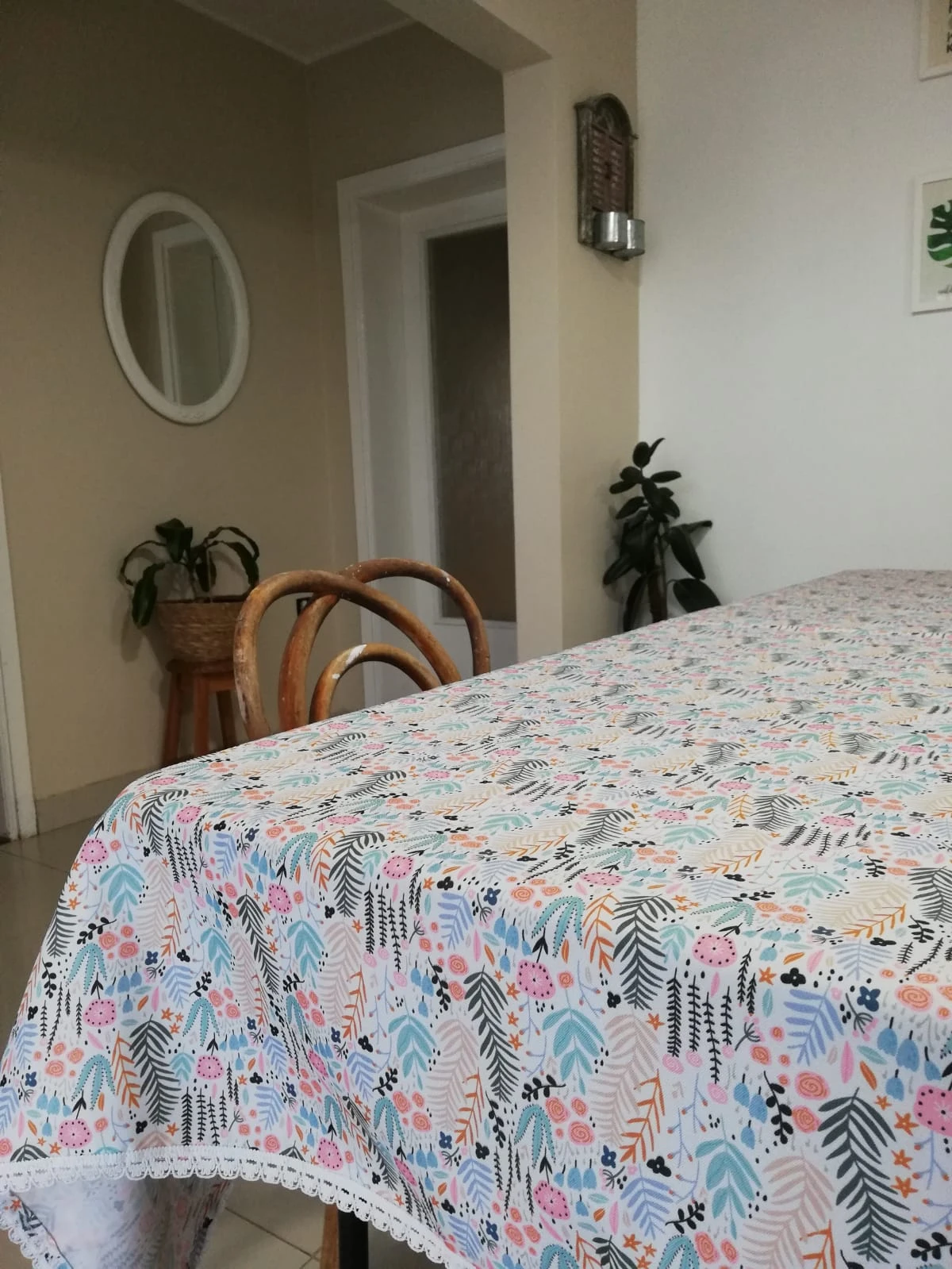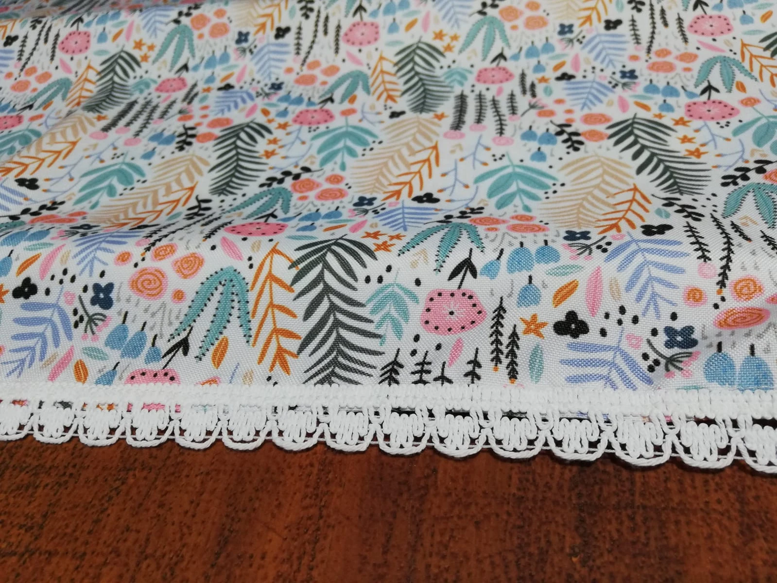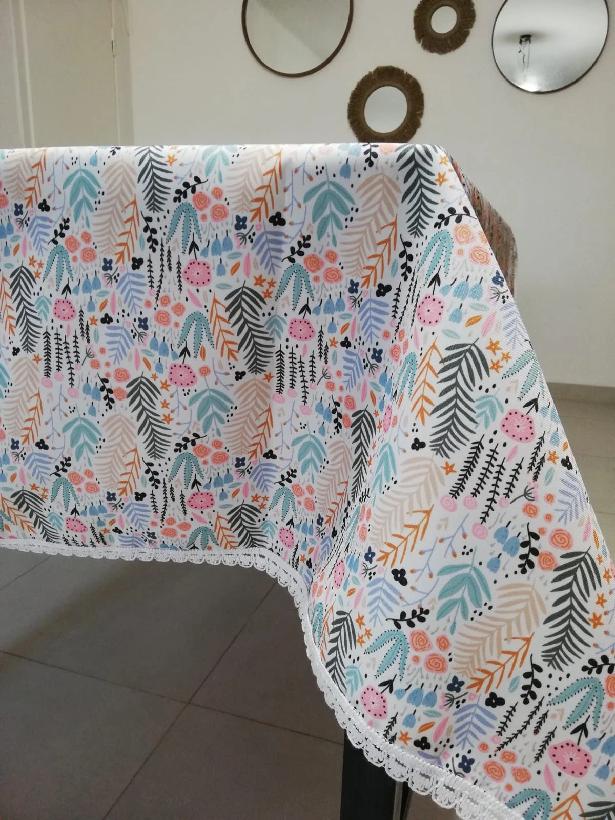 Mantel "Antiderrame" confeccionado en gabardina acrílica, con hermoso estampado de hojas flores y con detalles puntilla de algodón blanco en todo el contorno. Mide 2 X 1,5 mts. Apto para lavarropa.