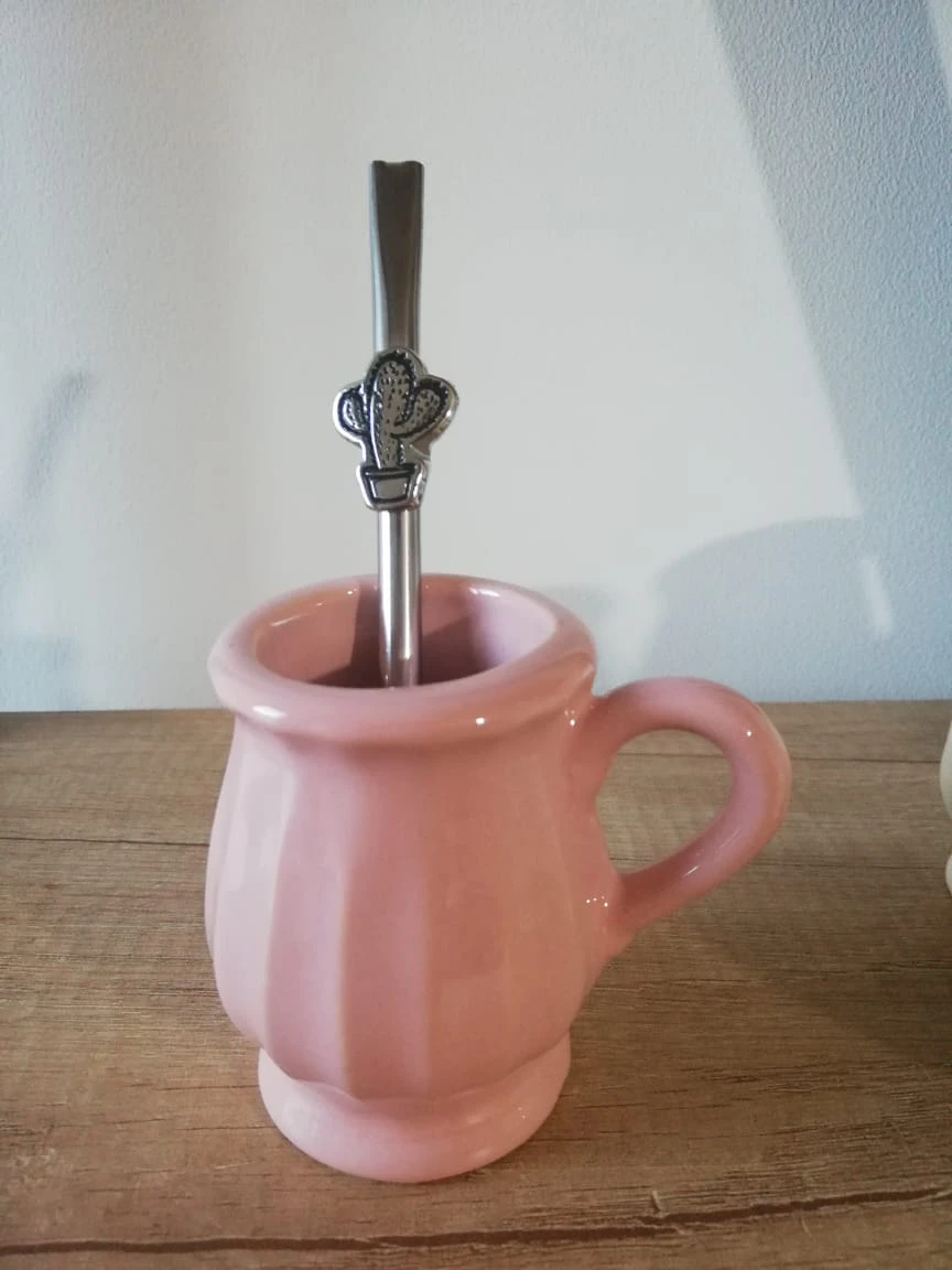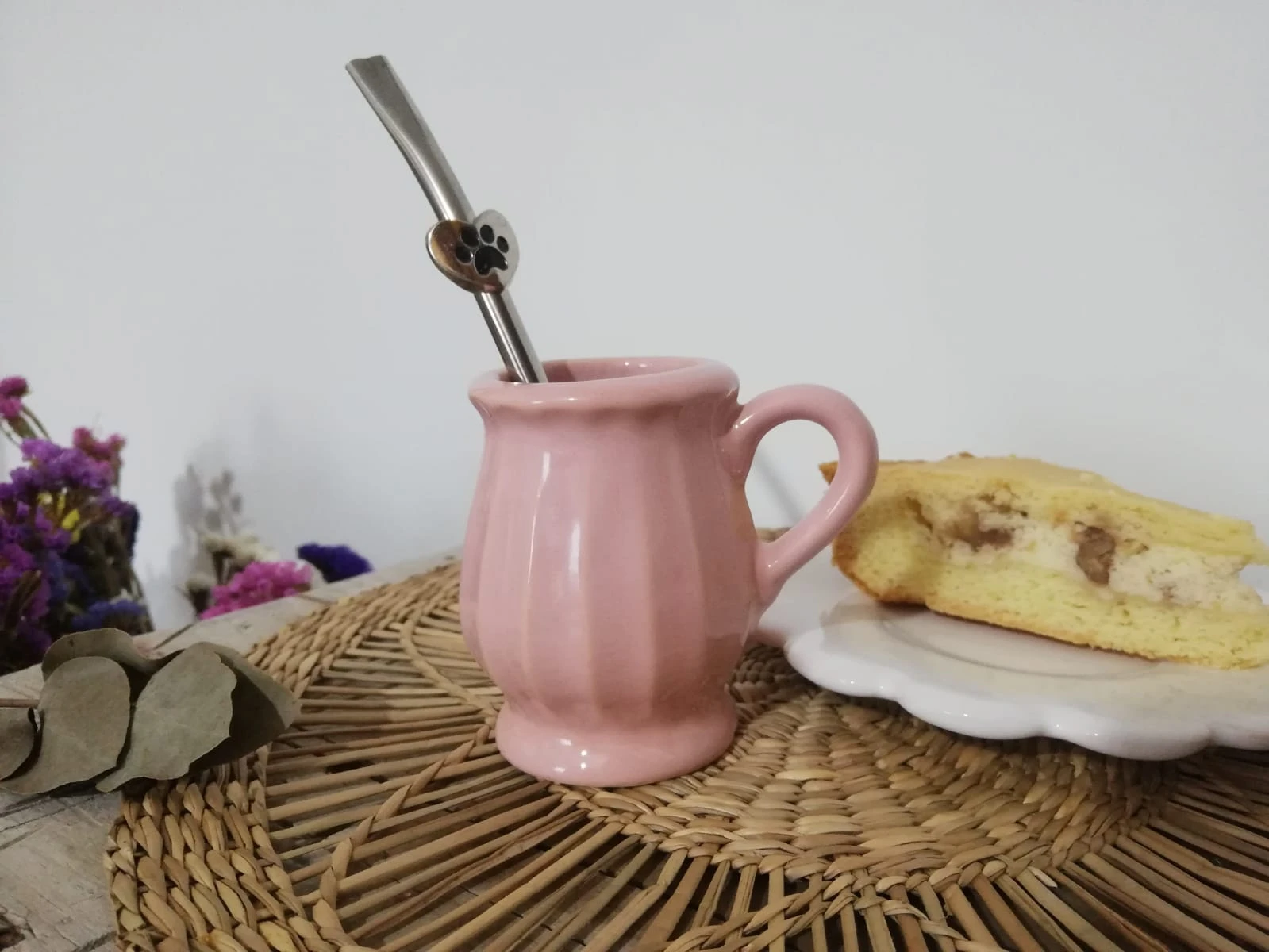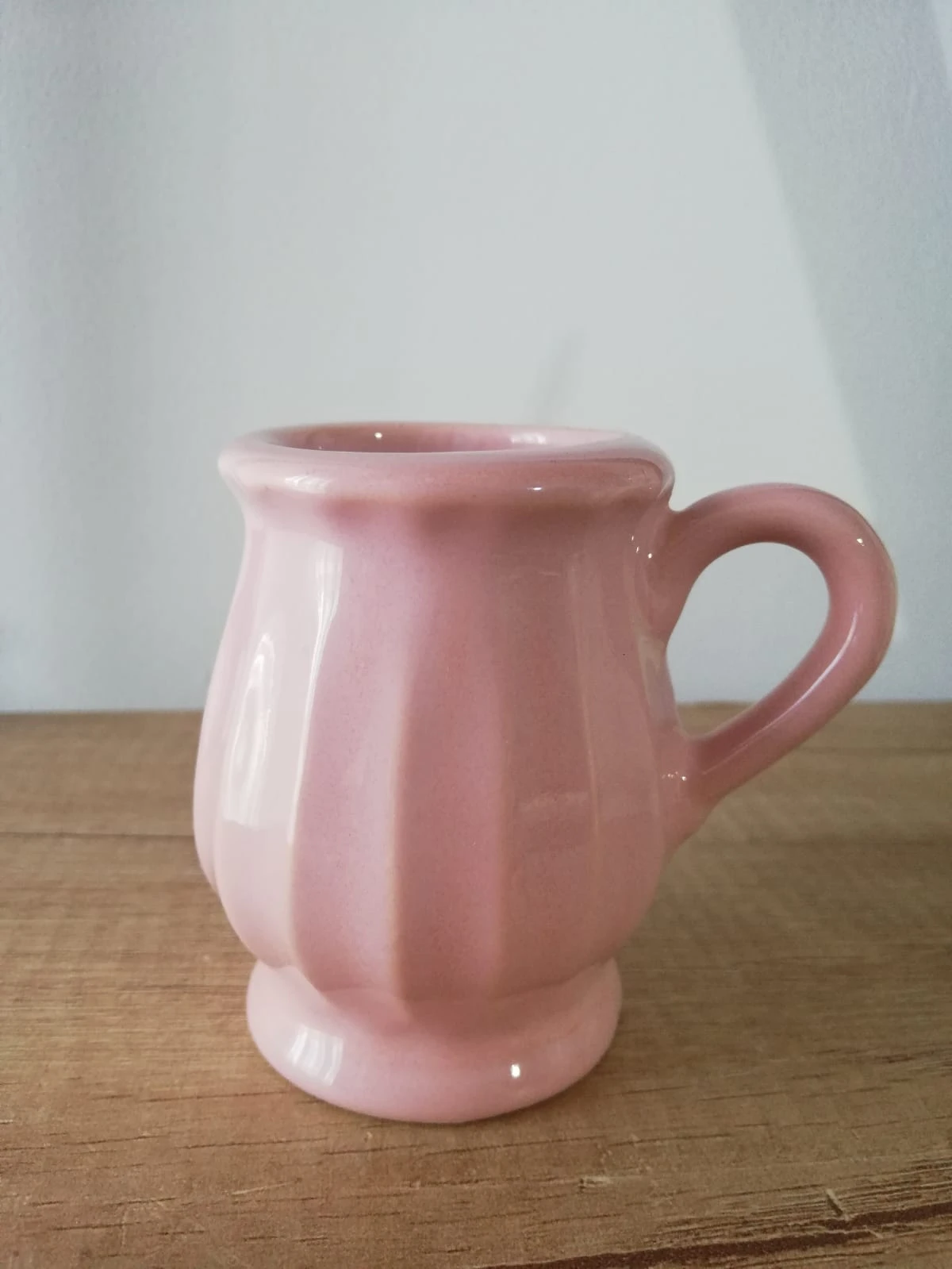 Mate de cerámica tipo "Jarrito". Es una pieza pequeña de 7,5 cm de alto y boca de 5,5 cm. Color rosa suave. Con manija.