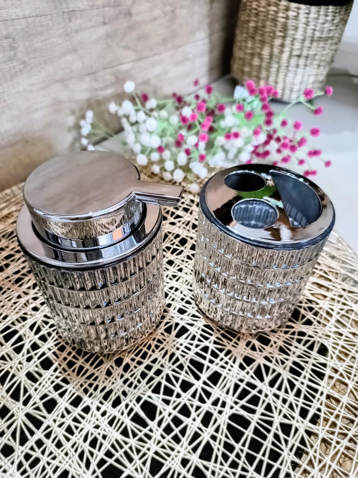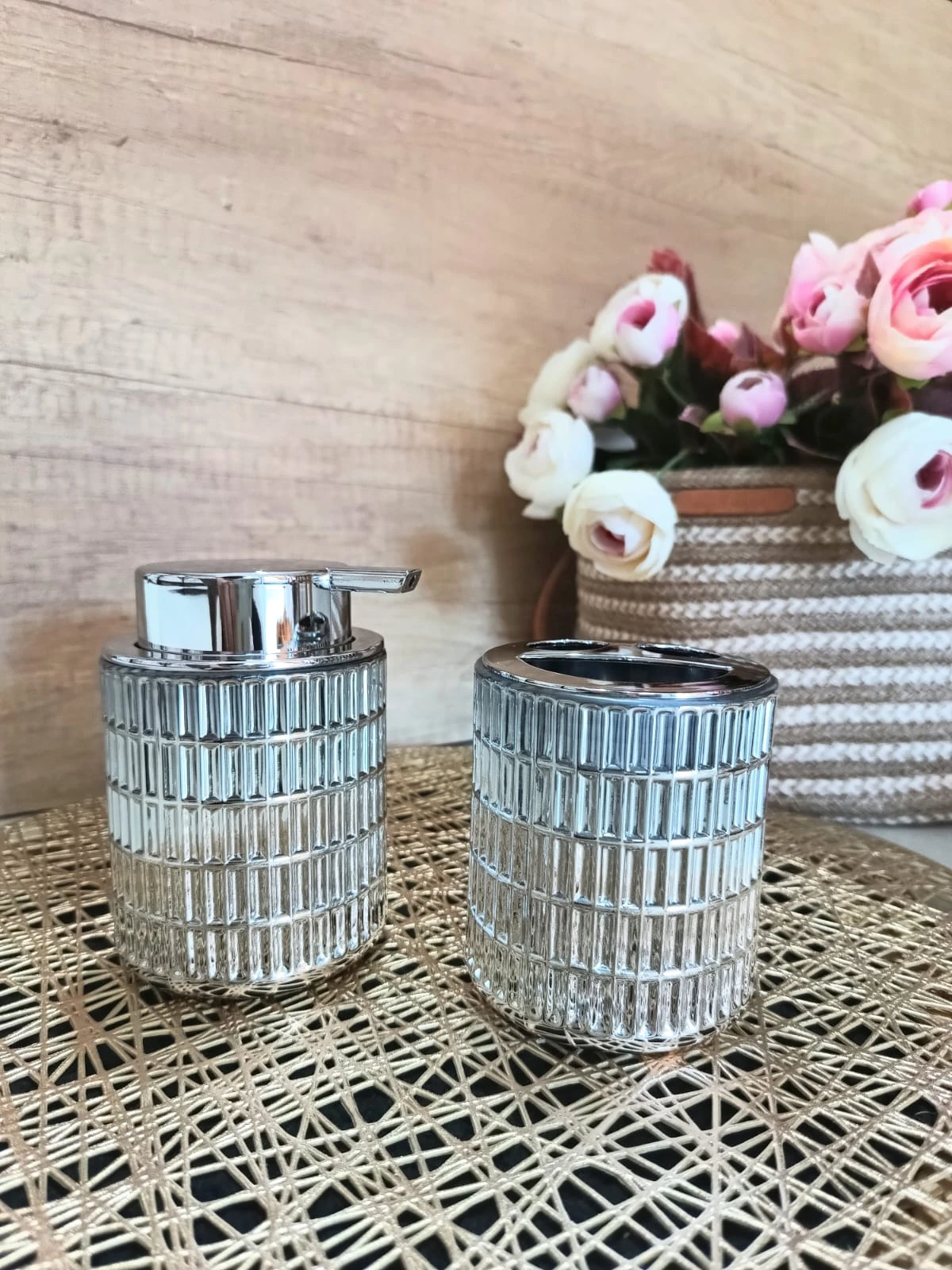 Portacepillo de vidrio transparente con detalles de texturas ralladas y tapa plástica de color plateado.