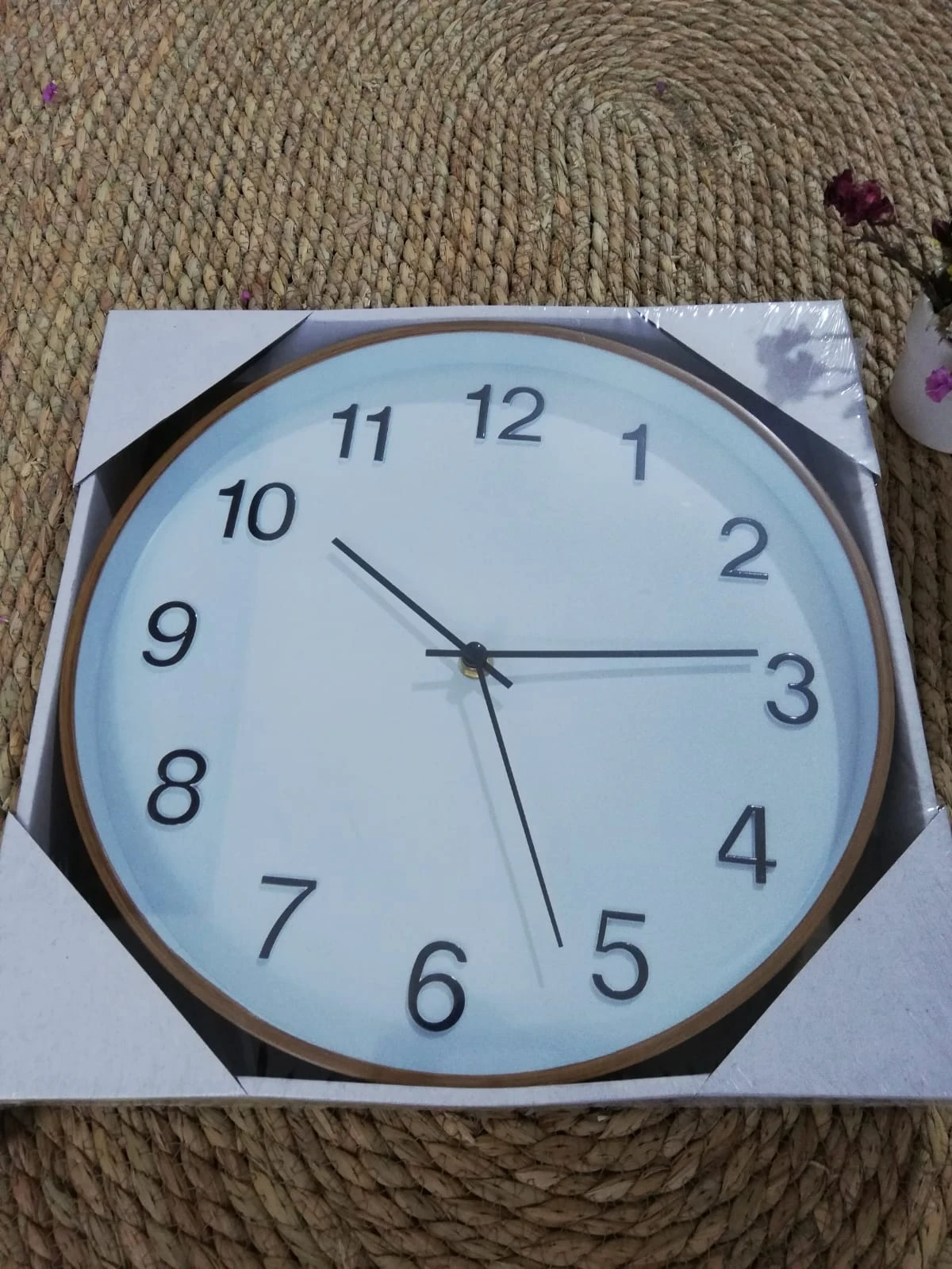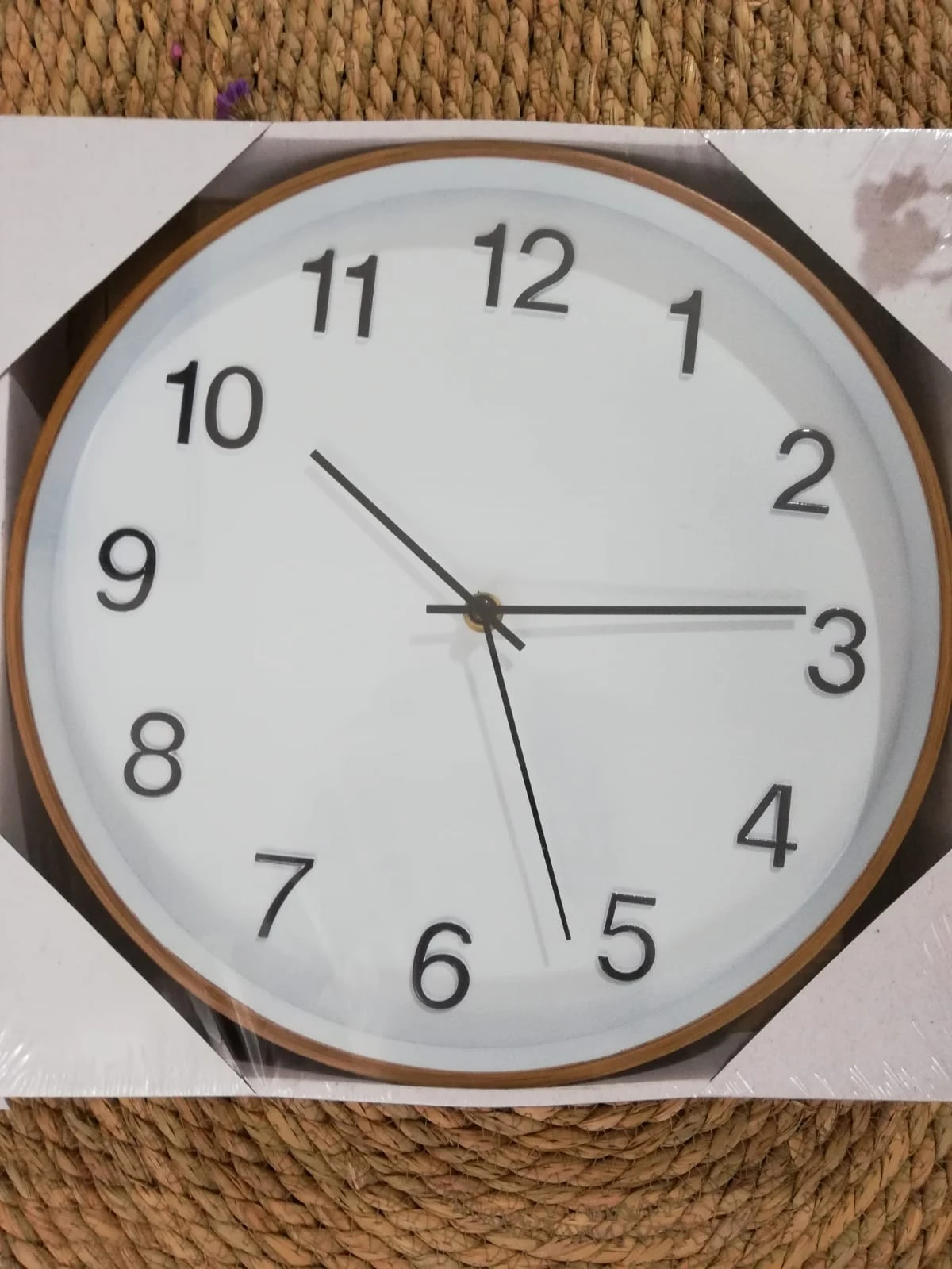 Reloj de pared de plástico, fondo color blanco, marco símil madera, agujas negras.