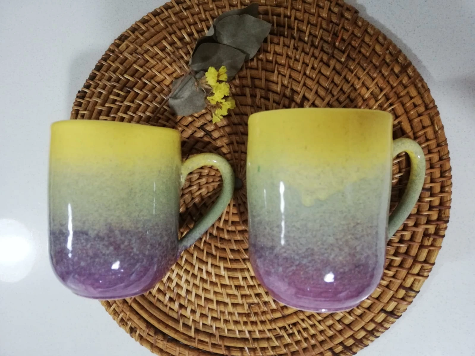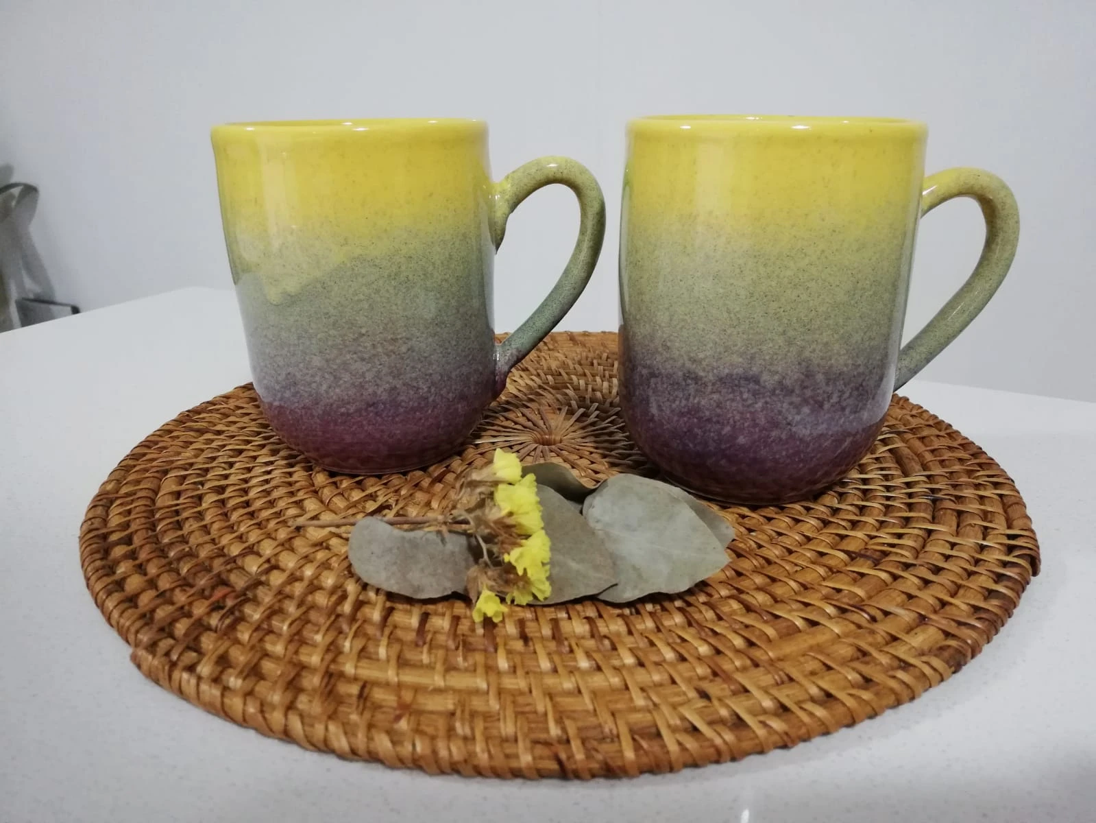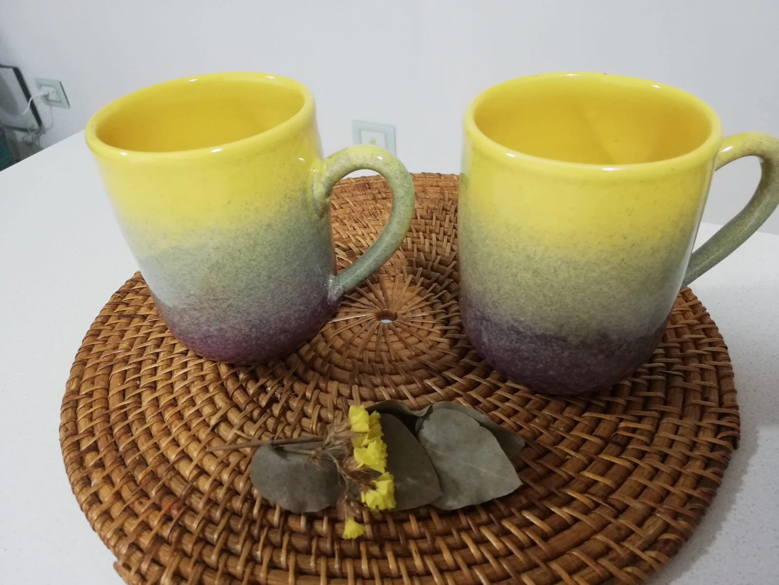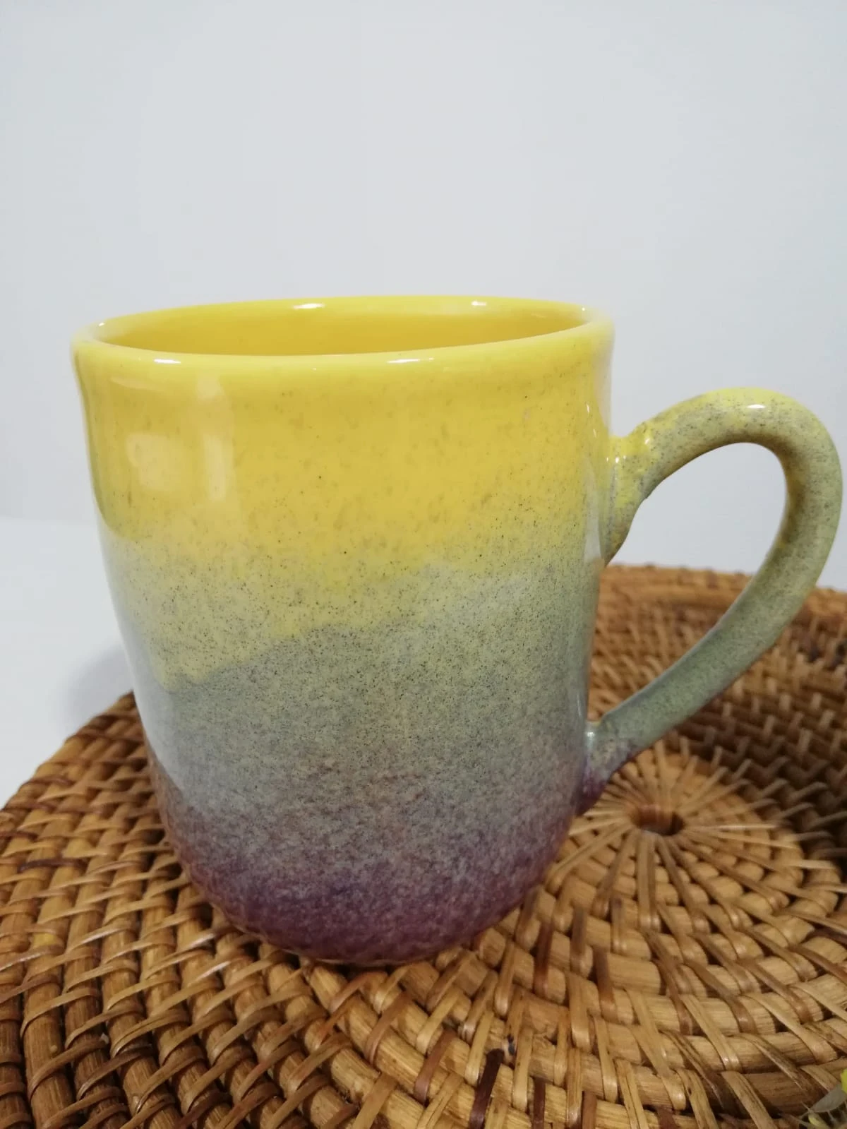 Taza de cerámica con manija, hecha a mano en tonalidades degradé que combina amarillo, verde y violeta.