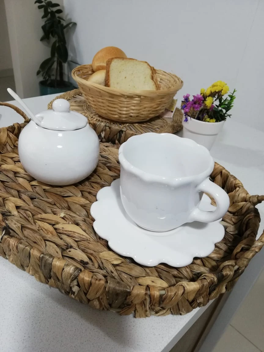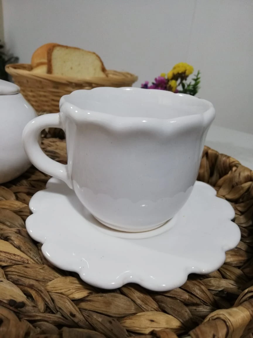 Taza de cerámica blanca, en conjunto con plato de apoyo con forma de flor.