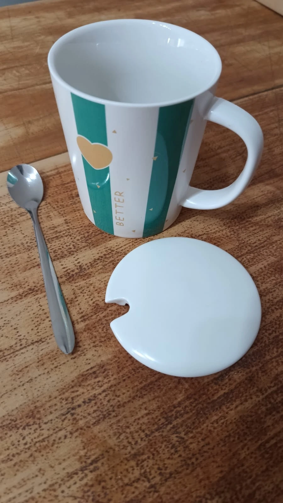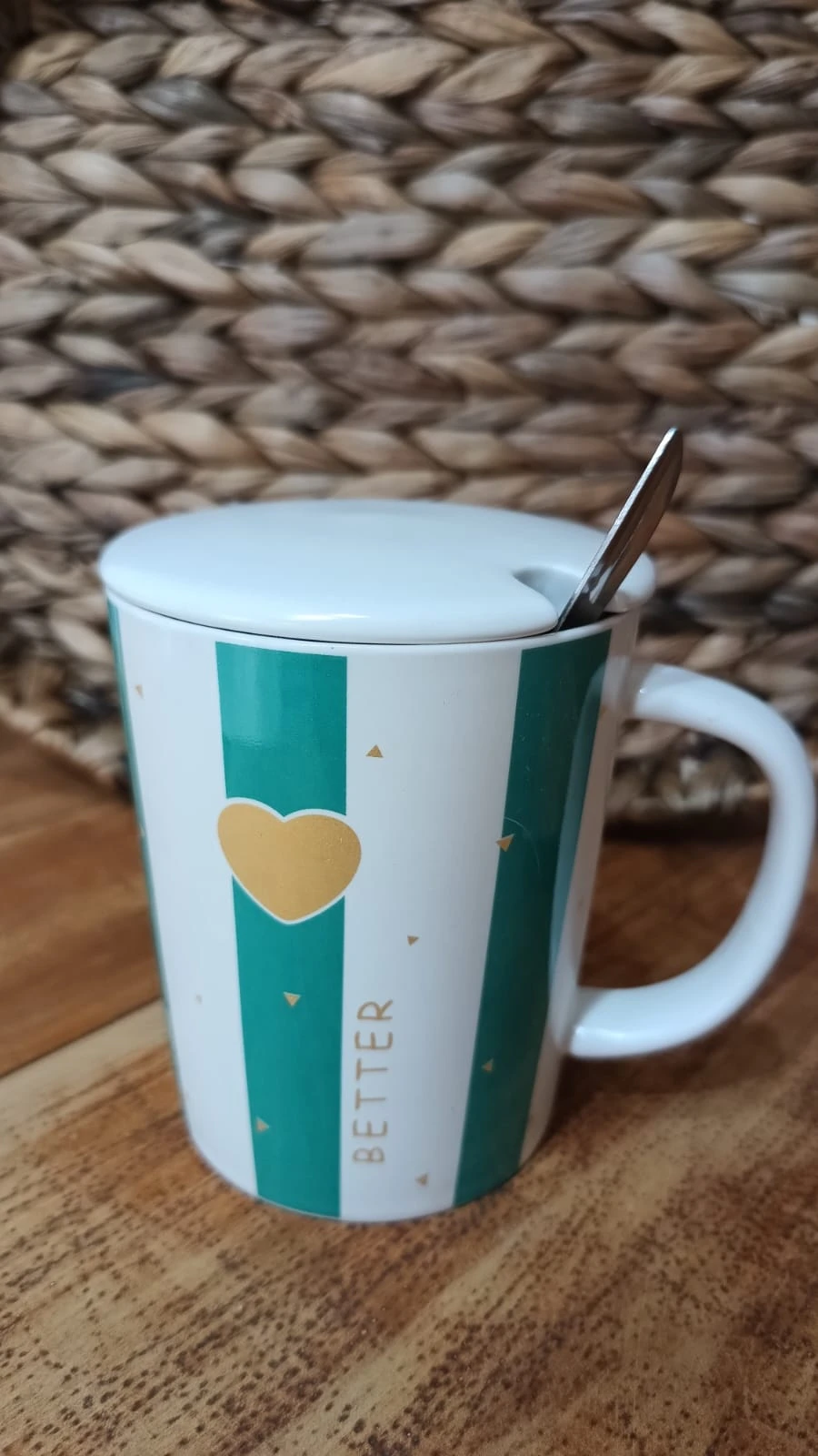 Hermosa taza de cerámica, diseñada en una base blanca con franjas verdes y detalles de corazones dorados . Cuenta con tapa de cerámica blanca cuchara de acero inoxidable.