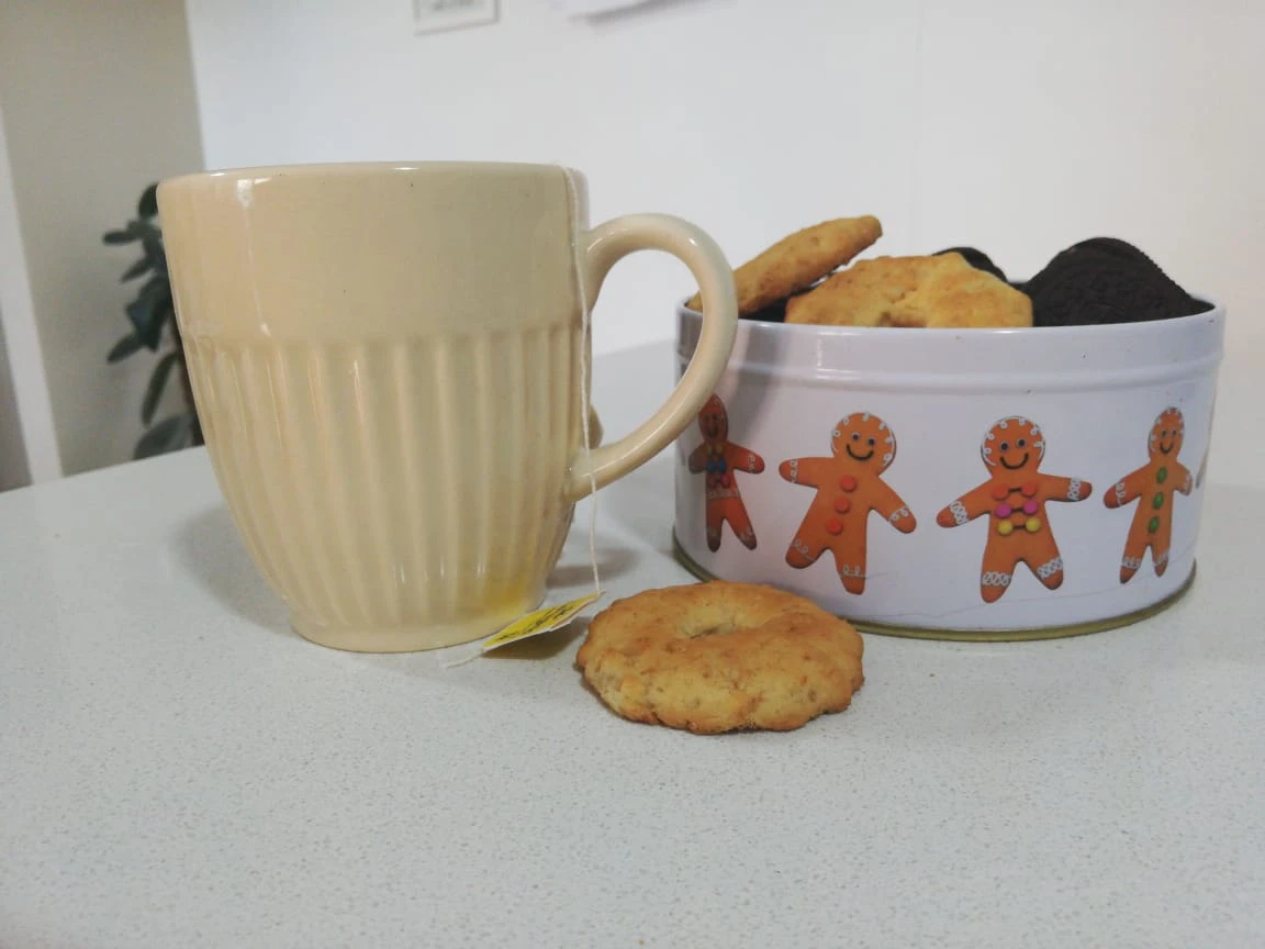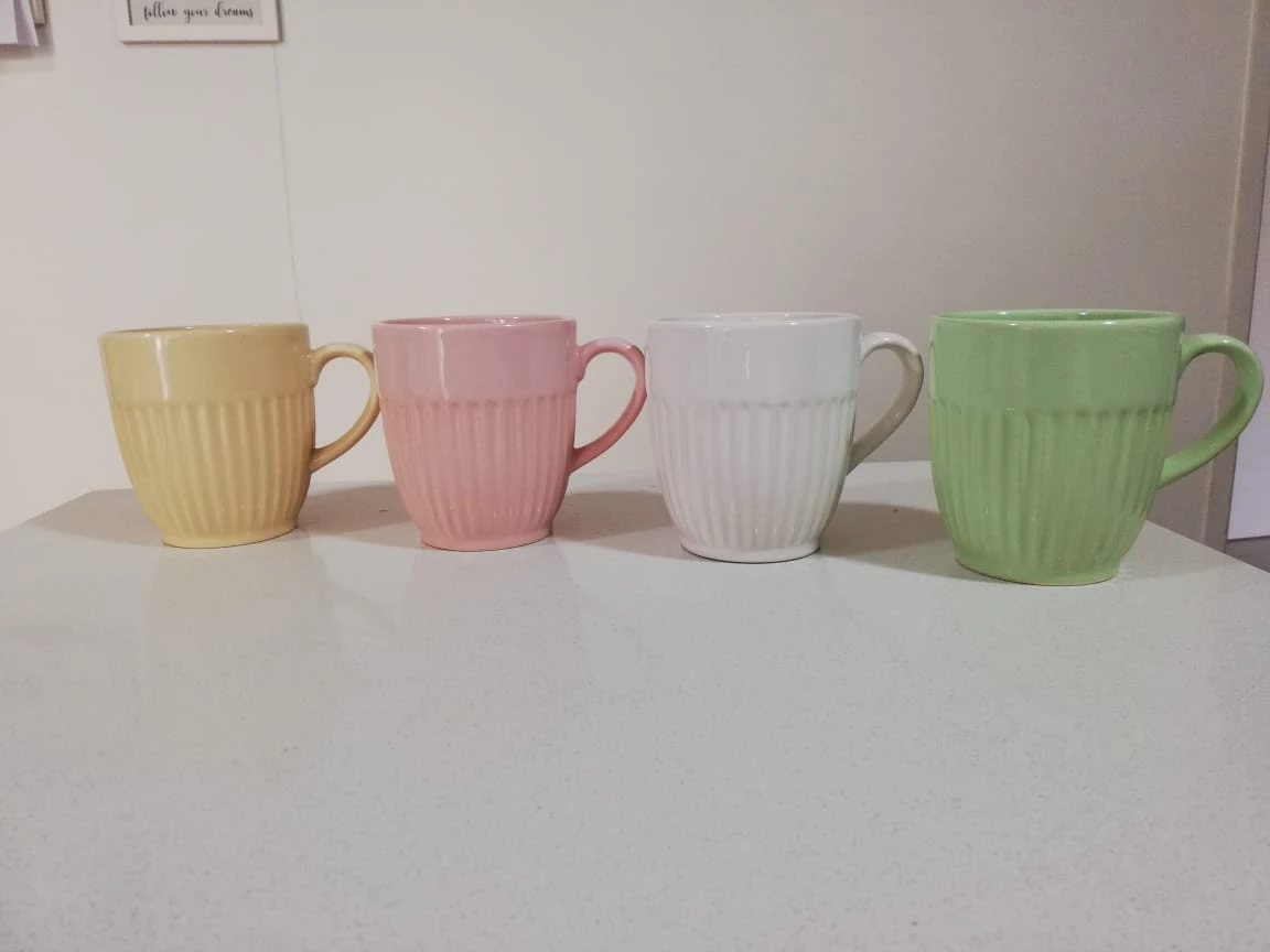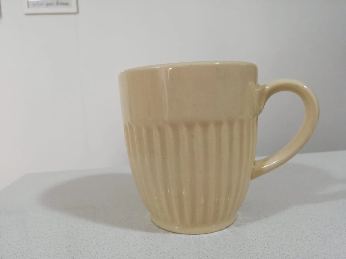 Taza de cerámica con manija color beige, con detalle de lineas texturadas en el contorno.