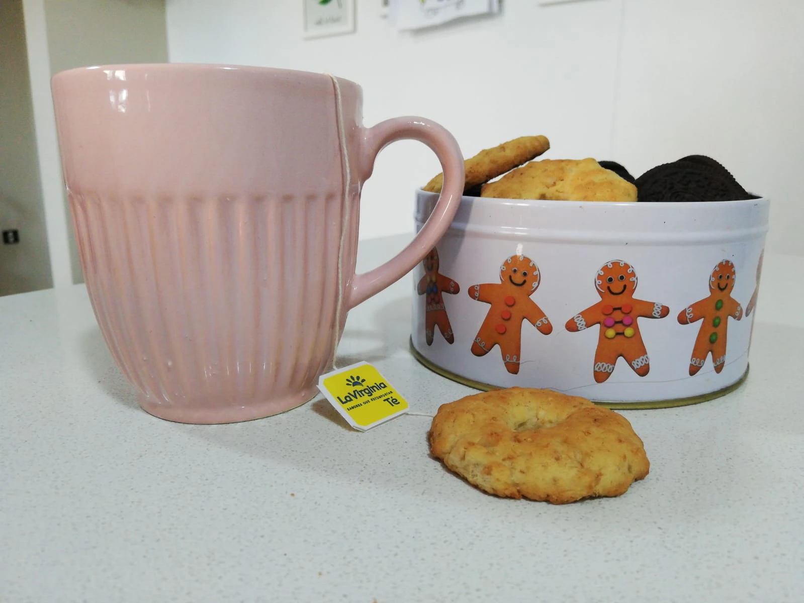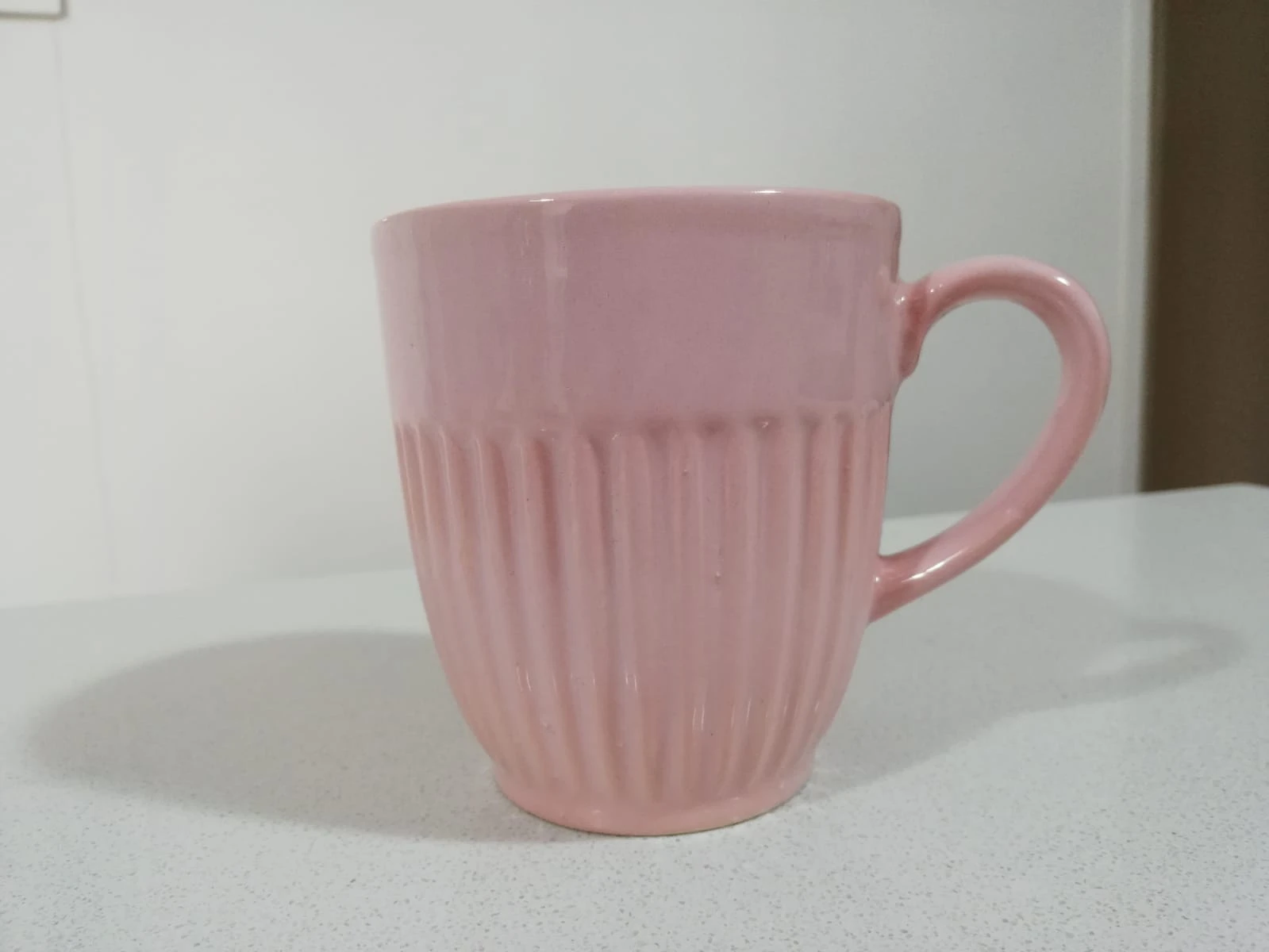 Taza de cerámica con manija color rosa, con detalle de lineas texturadas en el contorno.