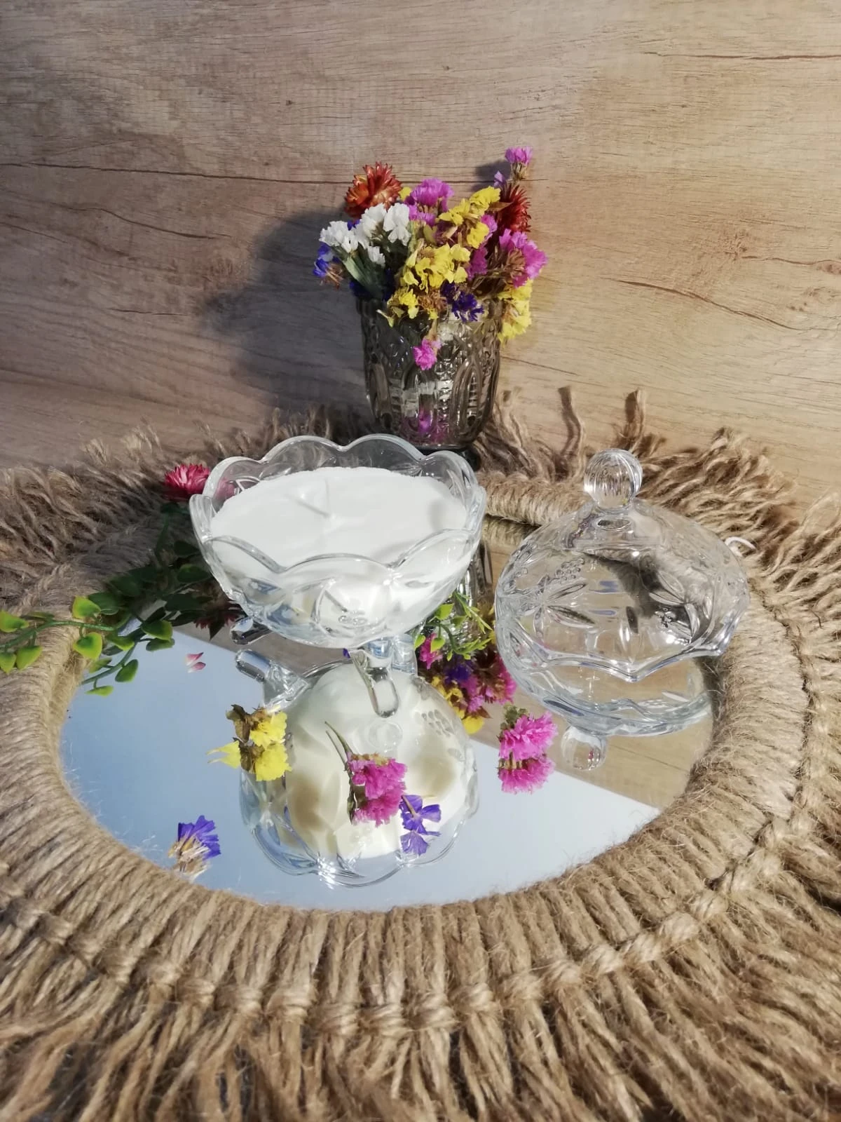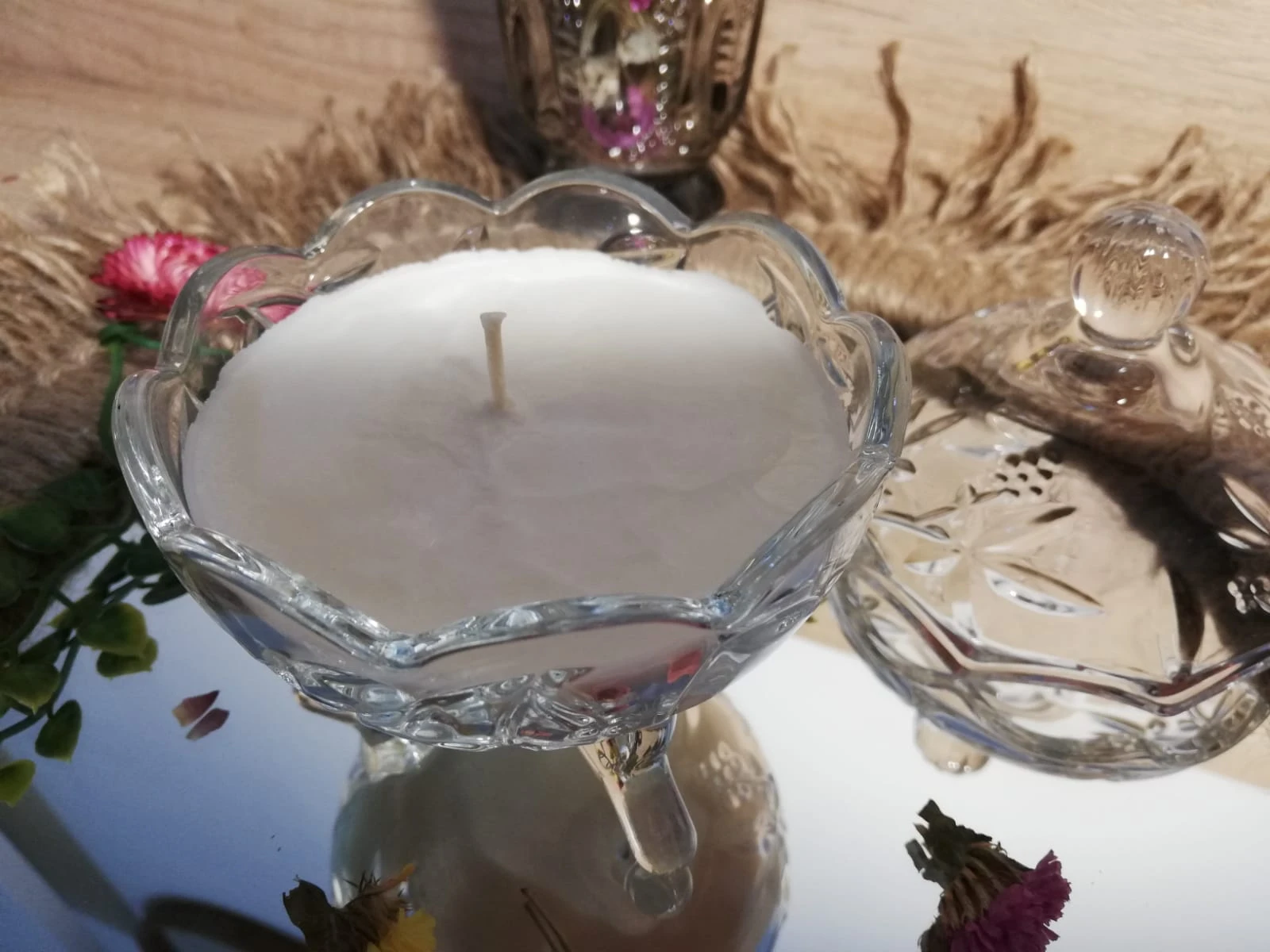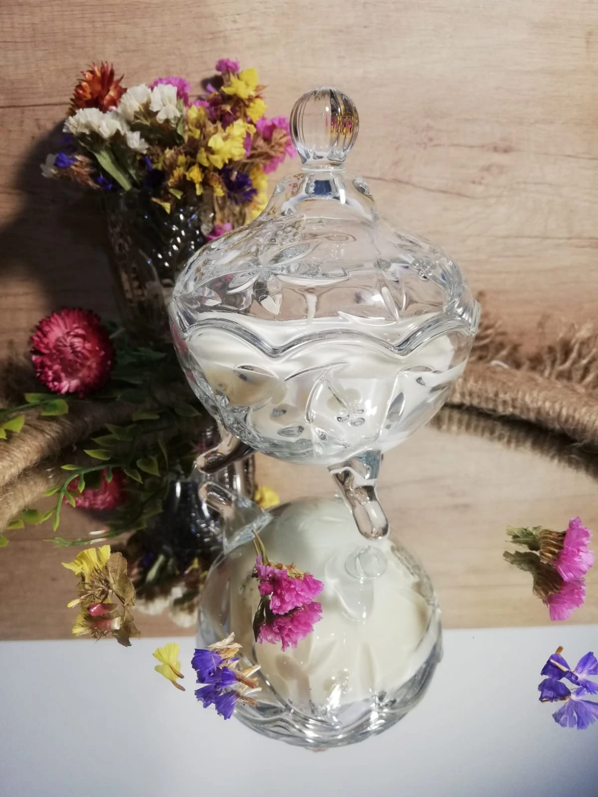 Vela aromática de cera de soja, contenida en embace de vidrio con detalles de texturas de estilo romántico. Estéticamente delicada y con un suave aroma a jazmín.