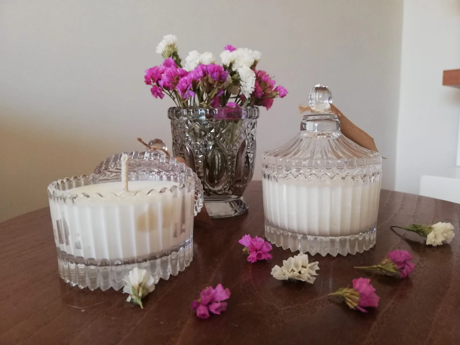 Vela aromática de cera de soja contenida en recipiente de vidrio con tapa de cierre. Estéticamente delicada y con un intenso aroma a coco y vainilla.